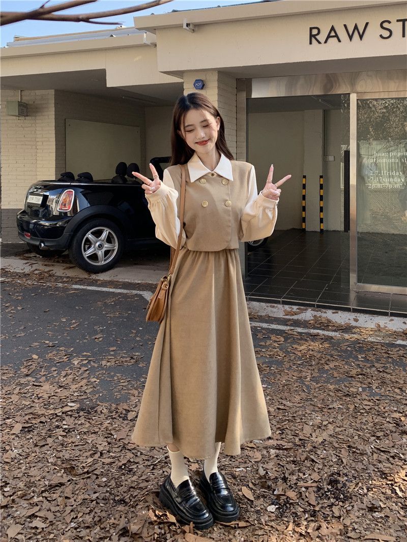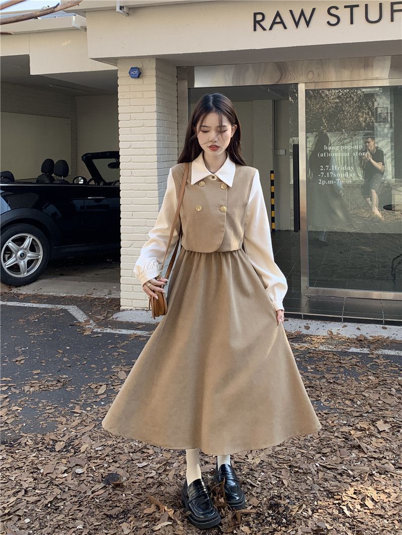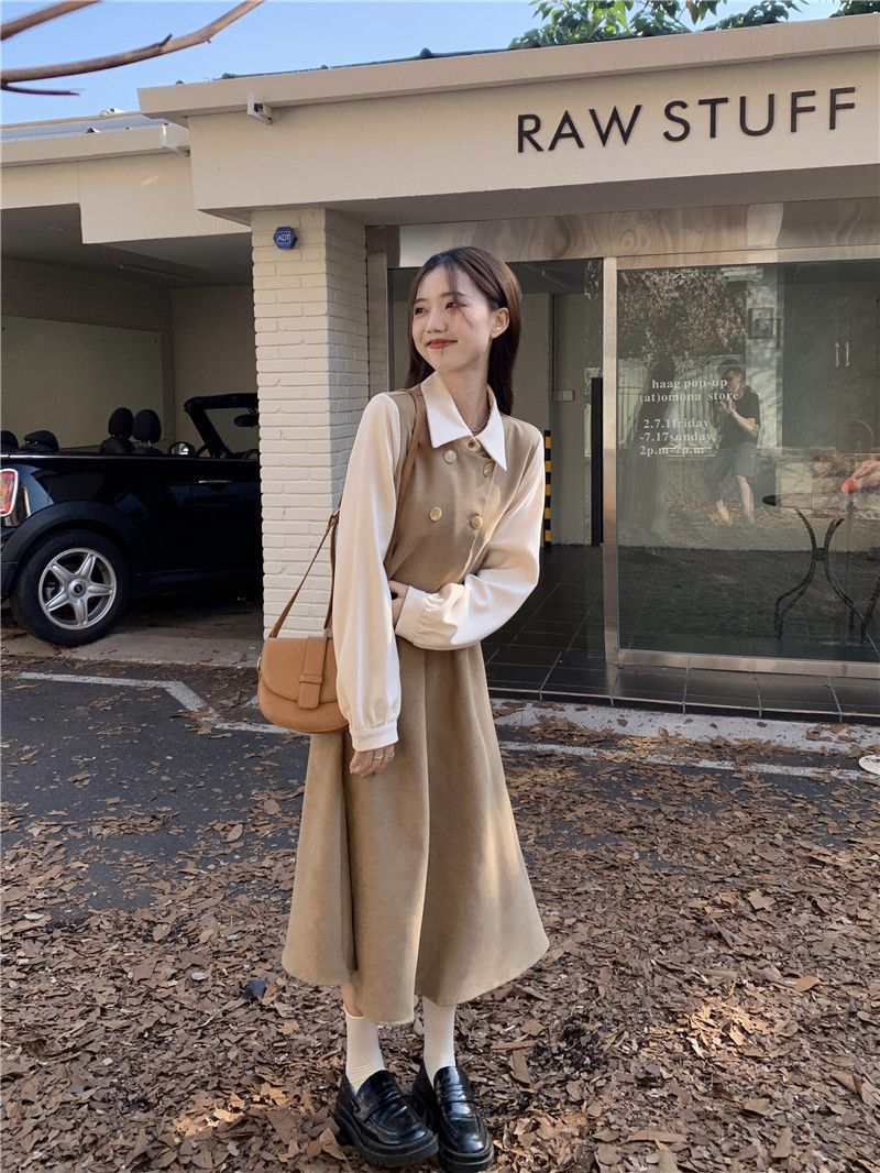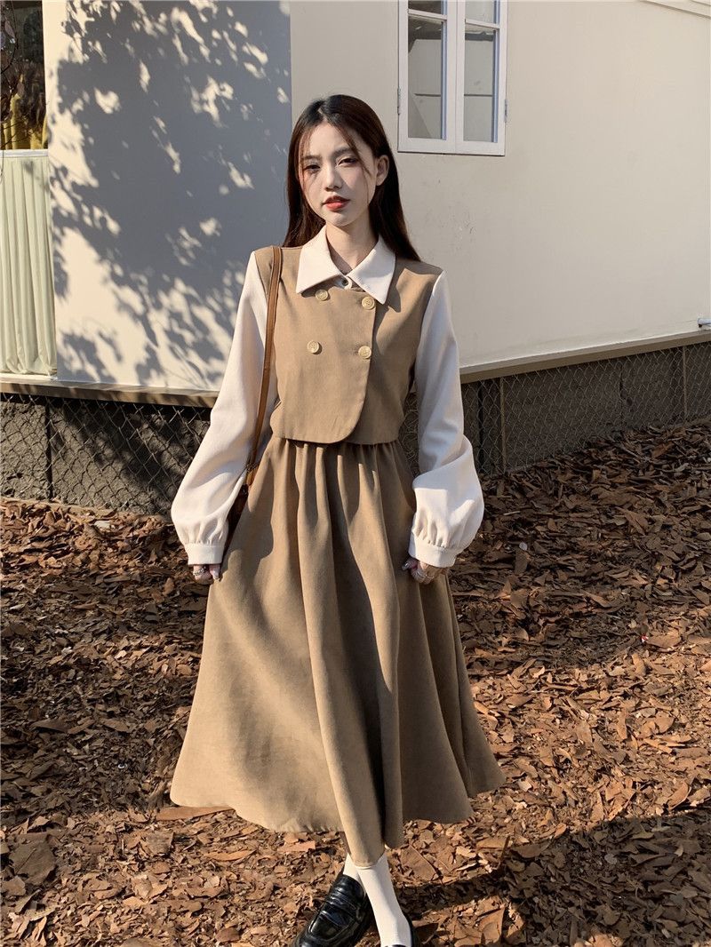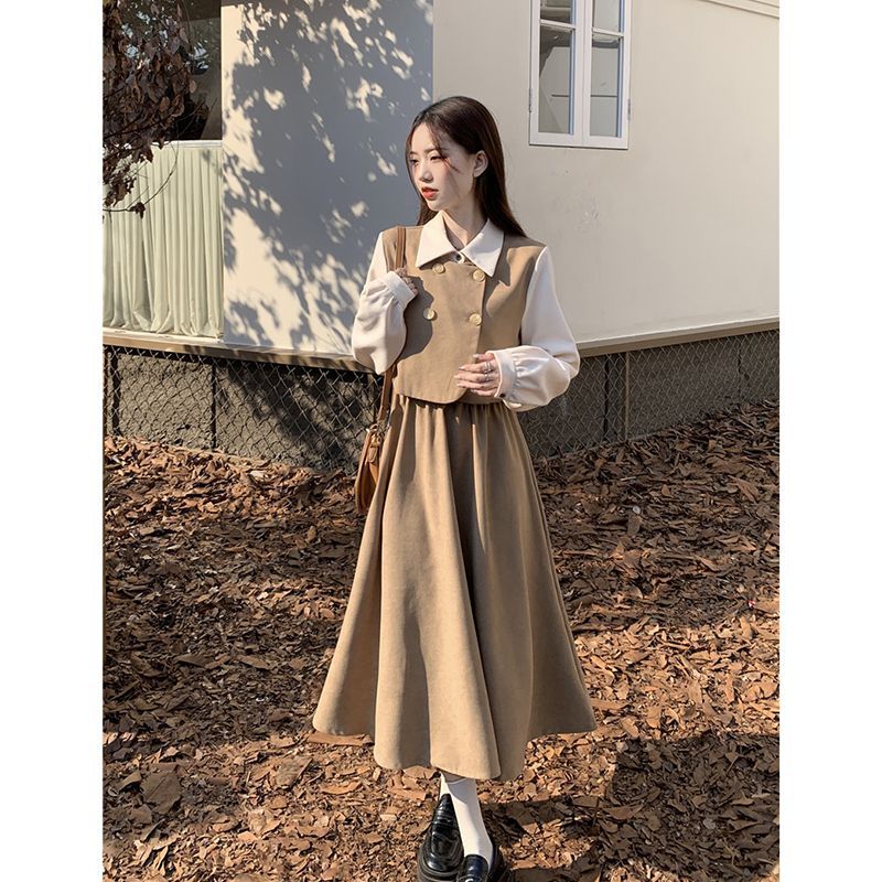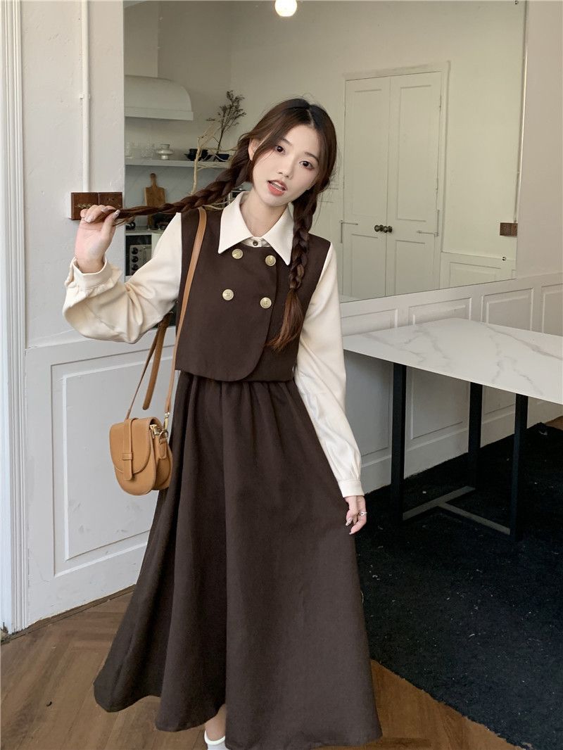 Womens Vintage French-Style Mock Two-Piece Long-Sleeve Dress