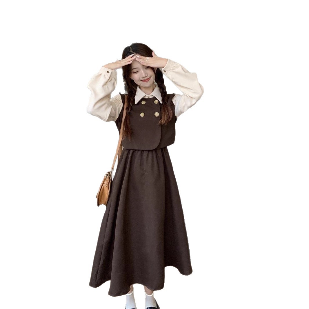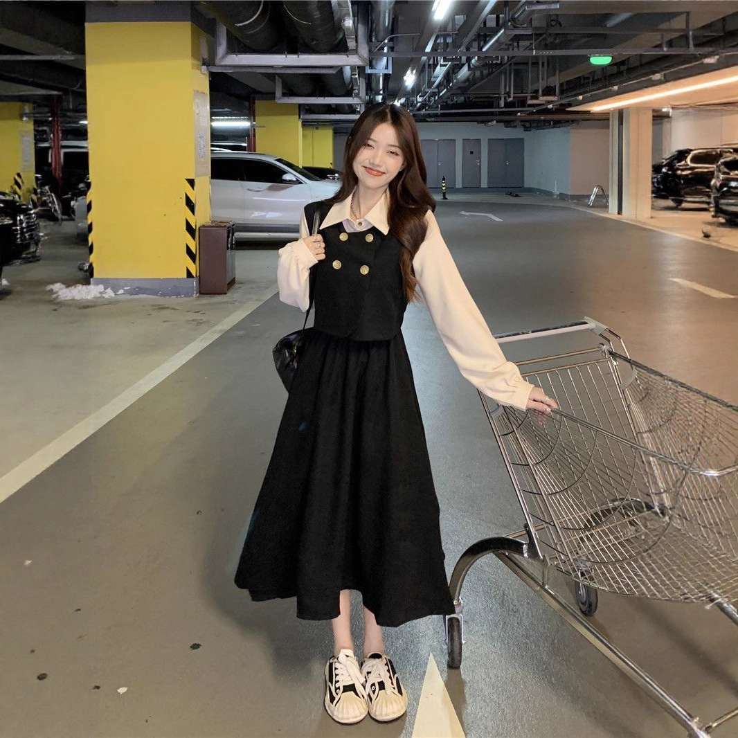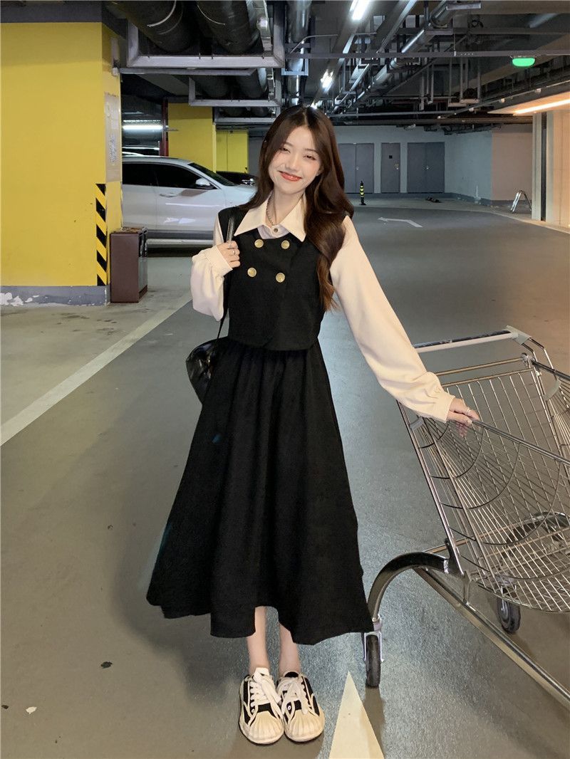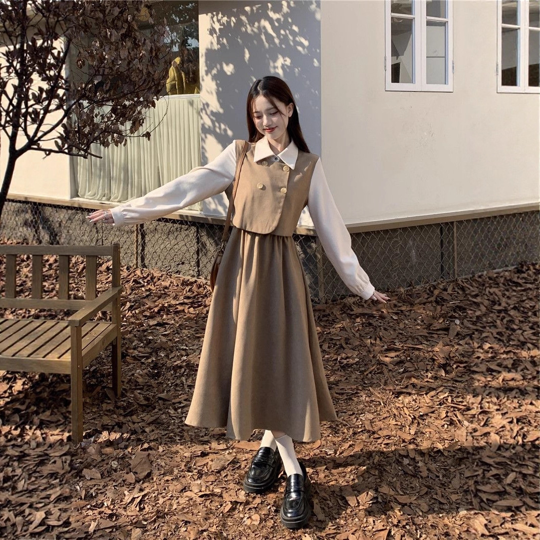 Womens Vintage French-Style Mock Two-Piece Long-Sleeve Dress