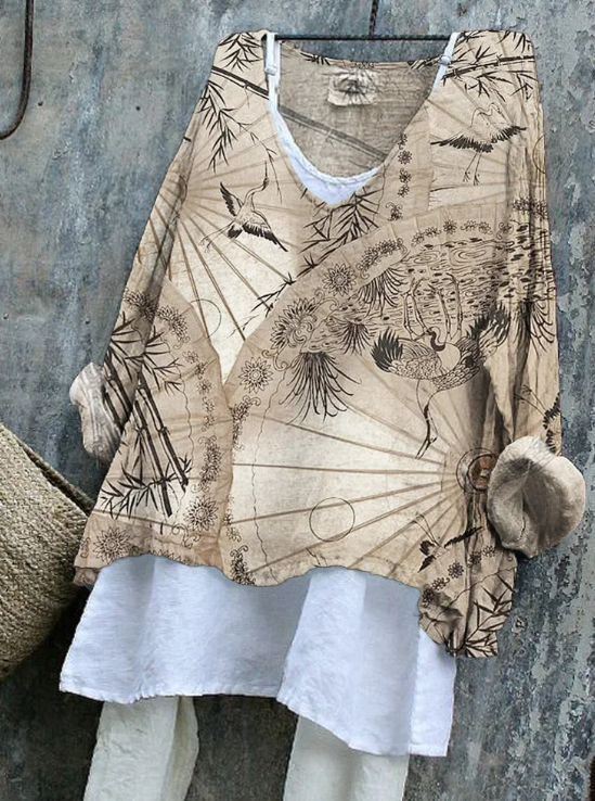 Women's Vintage Japanese Flower Crane Pattern Linen Blend Tunic