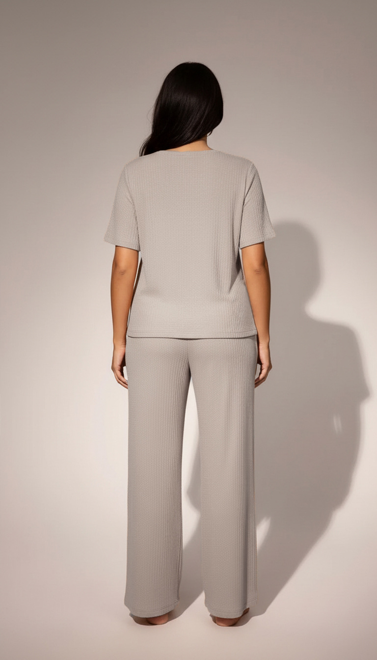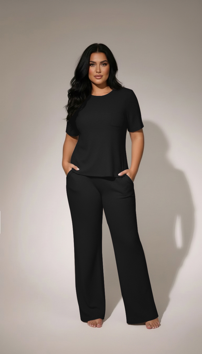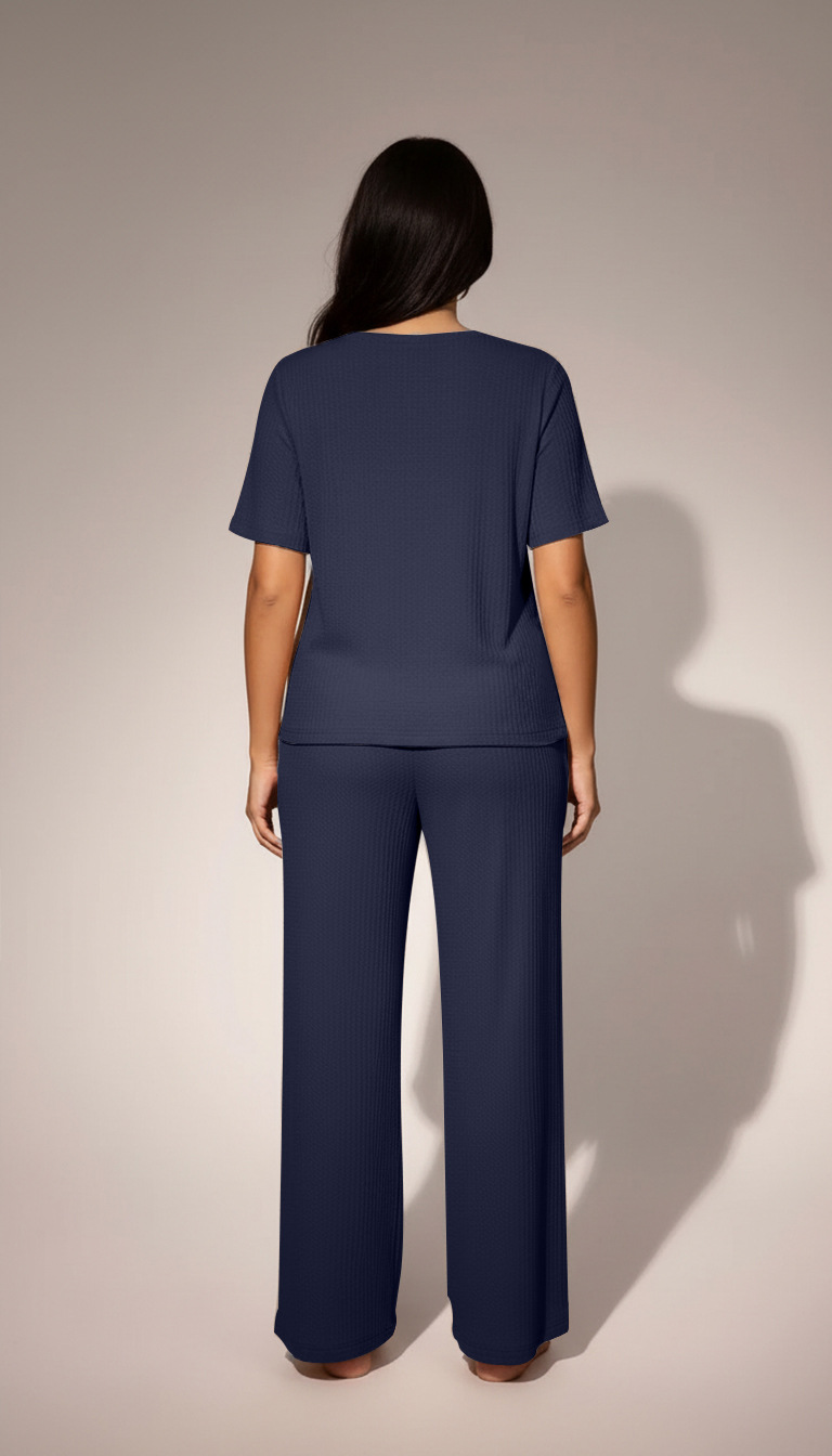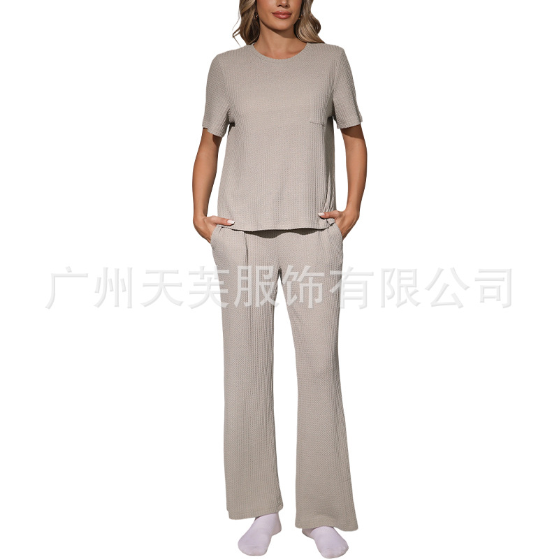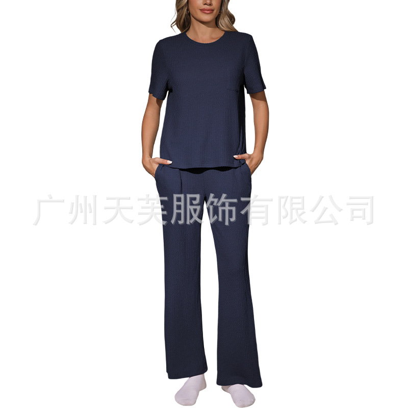 Womens Waffle-Textured Short-Sleeve And Long-Pants Set