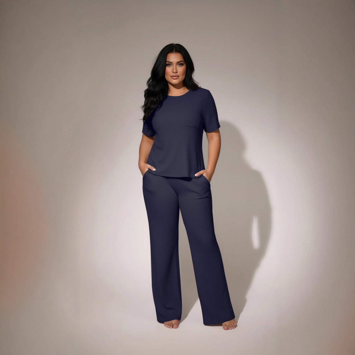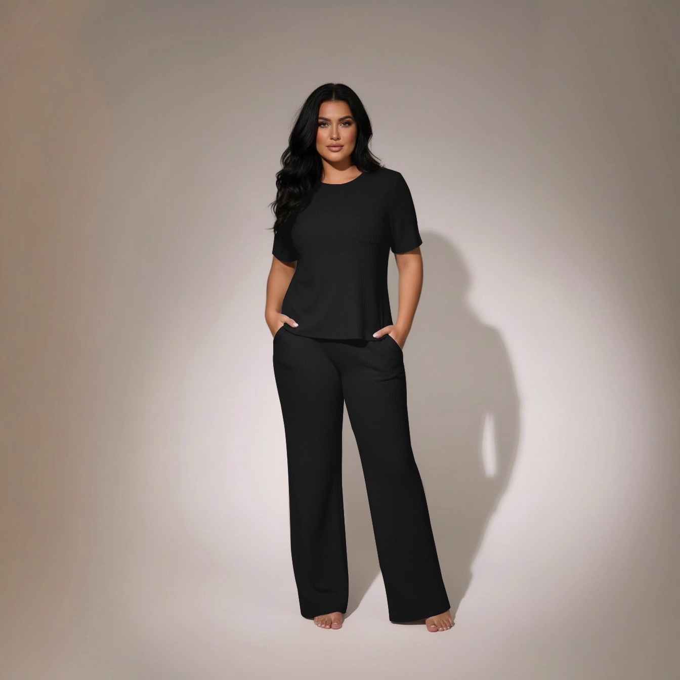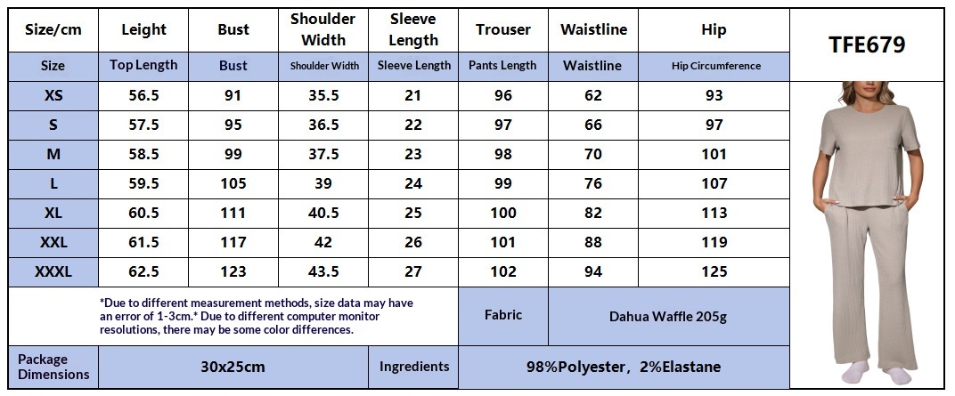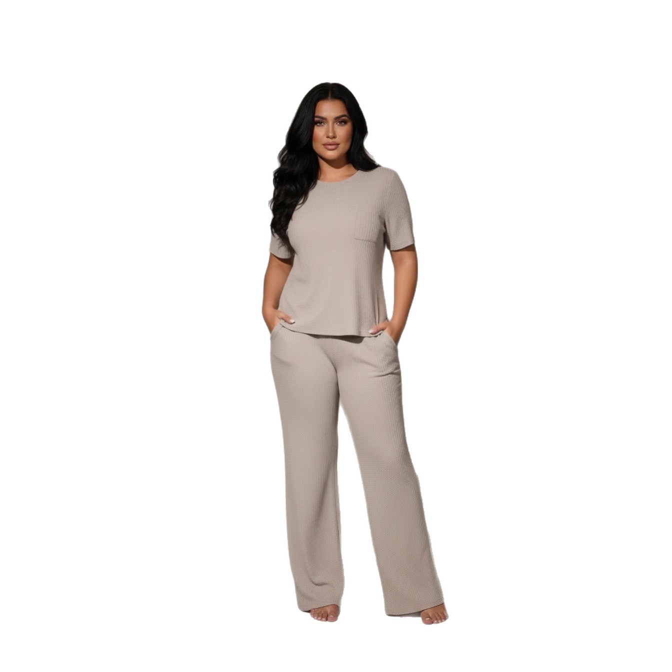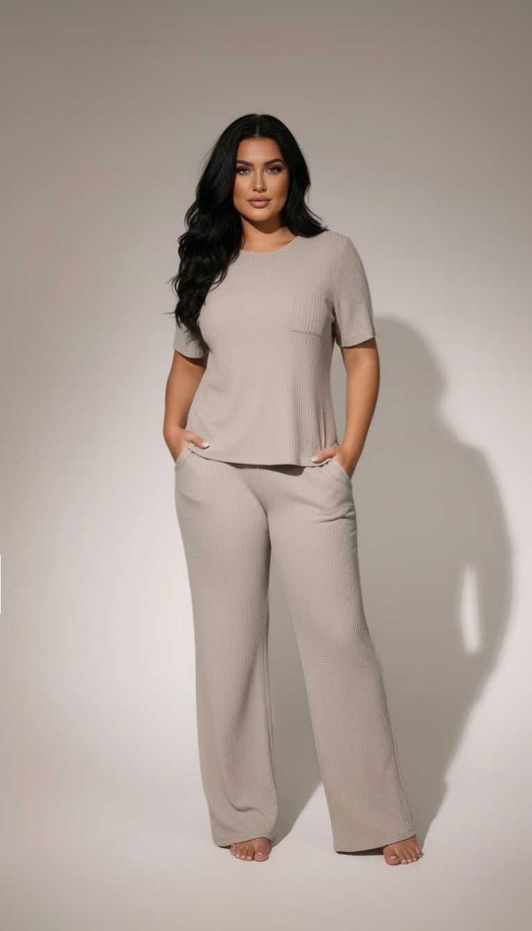 Womens Waffle-Textured Short-Sleeve And Long-Pants Set