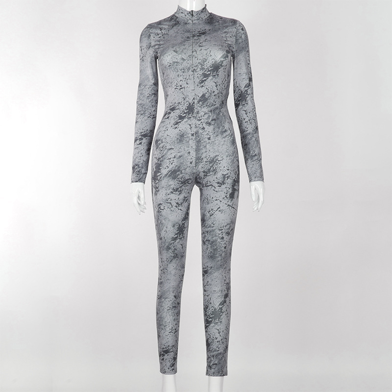 Women's Winter New Round Stand-up Collar Buttocks Slim-fit Chest Zipper Cool Print Jumpsuit