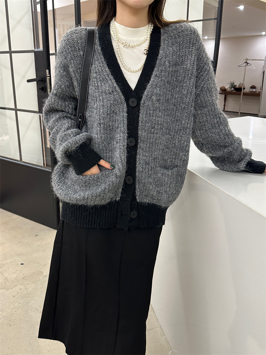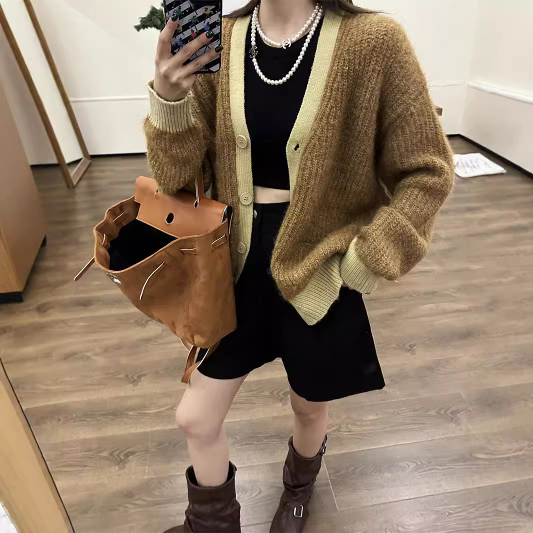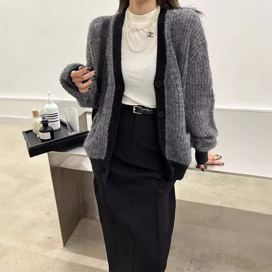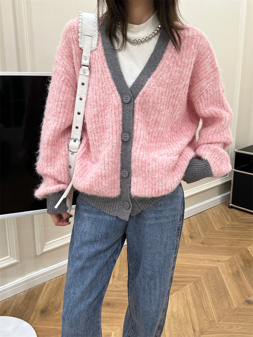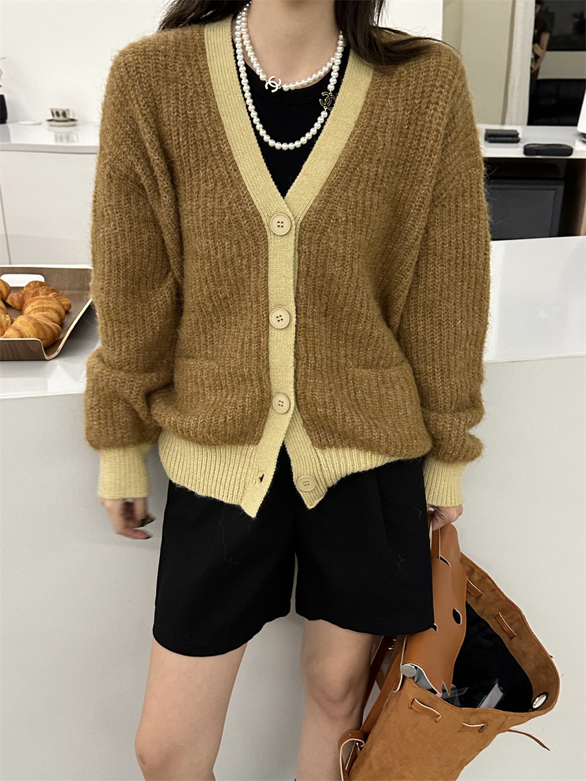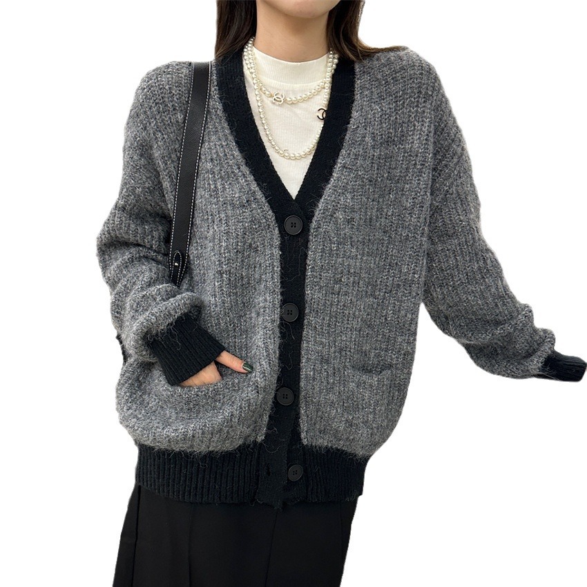 Women's Wool Contrast Color Knitted Sweater Cardigan V-neck