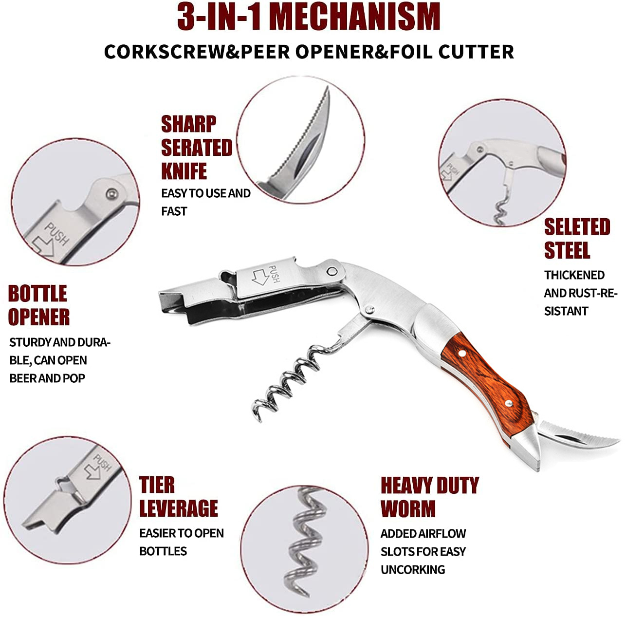 ✅Premium wooden multi-tool which includes an ergonomic grip, stainless steel foil cutter blade, spiral wine corkscrew, metal handle, and bottle opener.