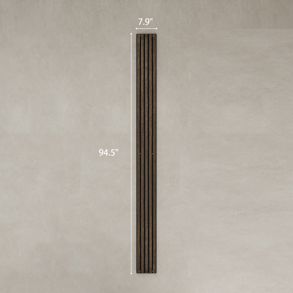 Features: - Acoustic panels that reduce noise and enhance sound quality - Their natural appearance allows for DIY slatted wall creation - The set includes four pieces for versatile setup options - Made from MDF and high-density polyester that give off no harmful emissions - Easy installation on walls and ceilings with screws provided Specification: - Color: Walnut - Materials: MDF, PET - Overall Dimension: 94.5" L x 7.9" W x 0.8" D - Single Strip Size: 93.9" L x 1.1" W x 0.5" D - PET Thickness: 0.4" D
