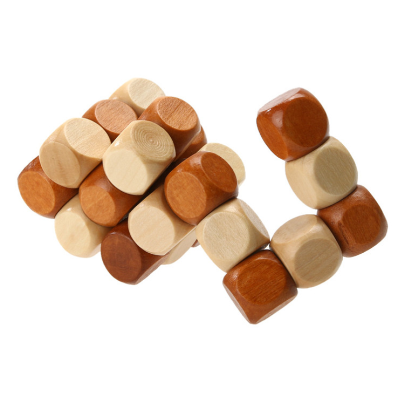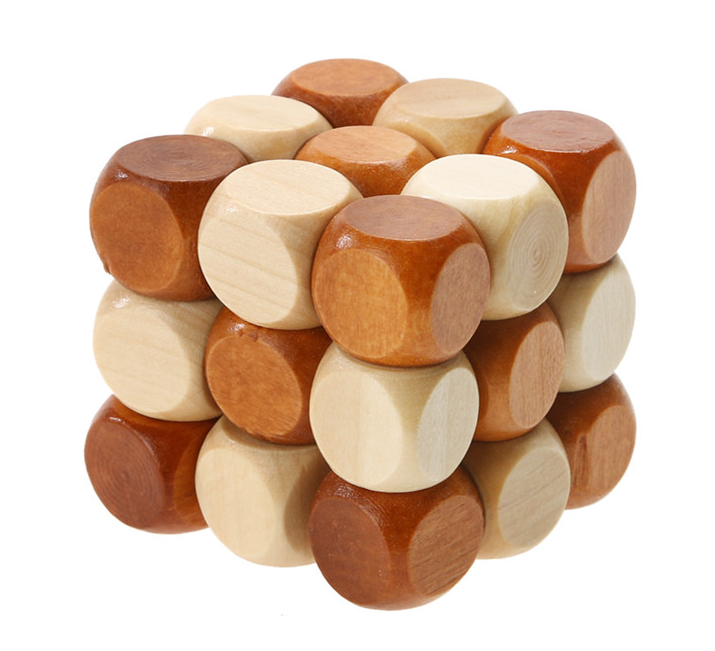 Wooden 3D Games: Made of 27 painted dices linked by a rope in groups of 2 and 3, the dices can be twisted. blocks are wood and connected by and elastic string, All rounded corners make for very smooth operation, high quality wood and well finished.