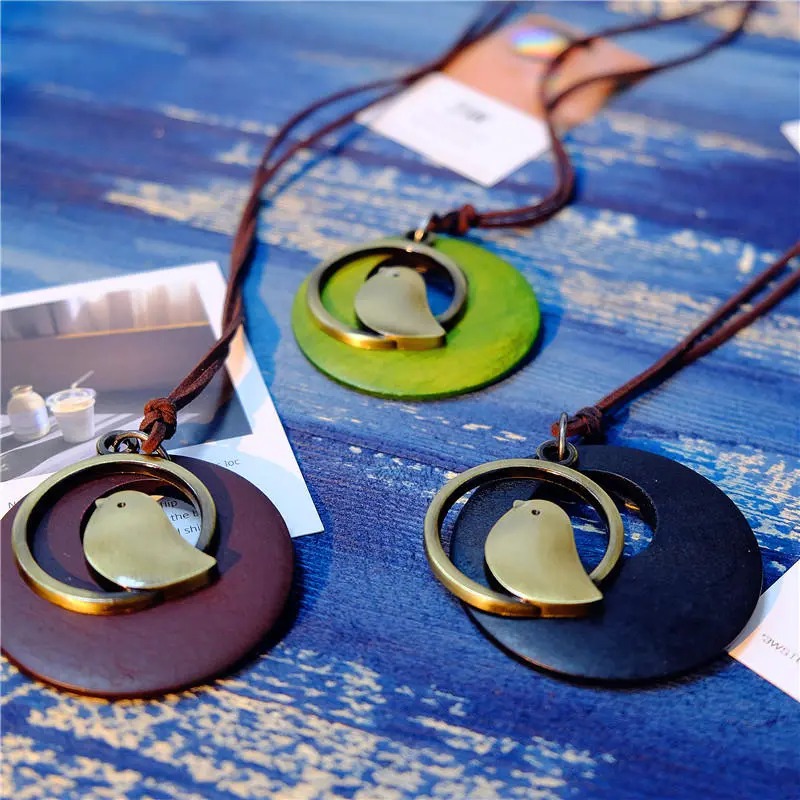 Wooden bird pendant long necklace