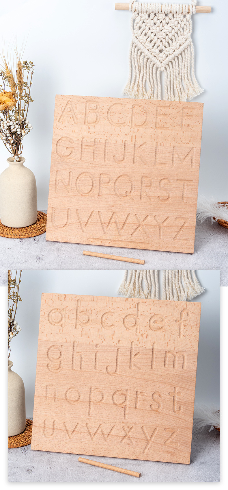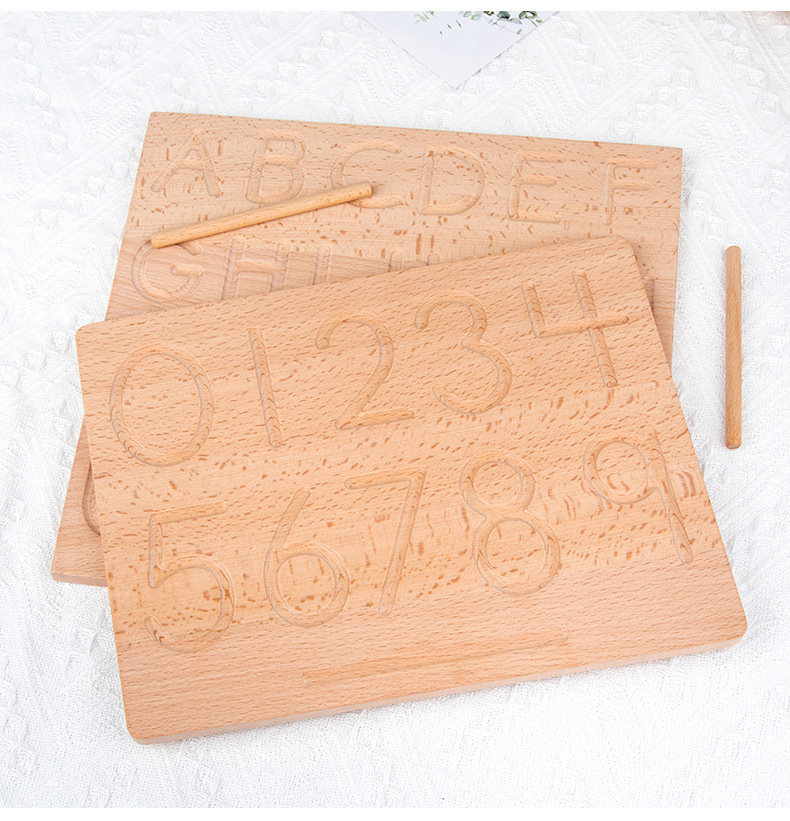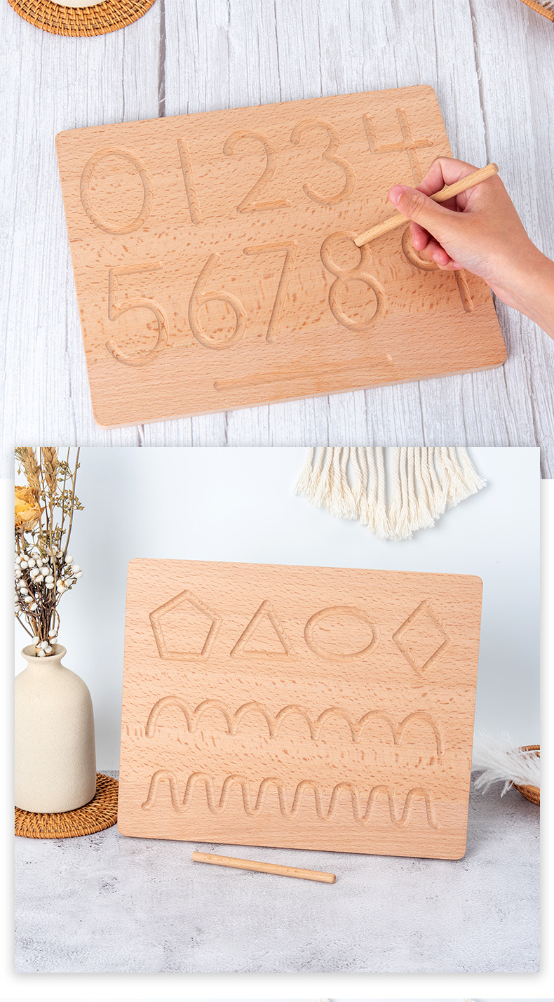 This beautiful wooden tracing board with wooden stylus is a fun and helpful tool for children in writing their first letters. It has guide arrows for young learners to follow the direction.