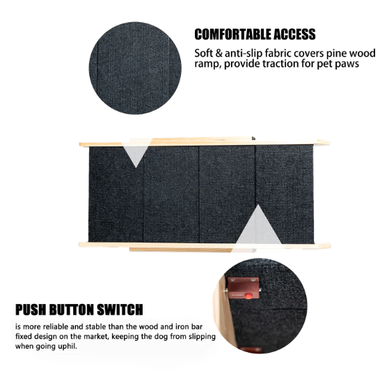 Ramps: Ramps are carefully designed with smooth surfaces to ensure a seamless transition for your pet.