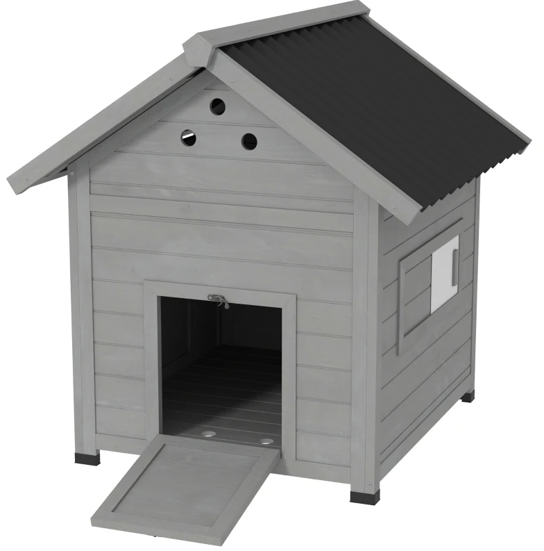 Features: - Opening top and removable bottom for convenient cleaning - Front door ramp and side door enable easy access for ducks - Sloped roof lets water roll down - Made of fir wood with water-paint - Side window for easy observation - Ventilation holes ensure proper airflow and ventilation - Suitable for housing three ducks - Assembly required Specification: - Color: Light Gray, Black - Materials: Fir Wood, Plastic - Overall Dimensions: 30.75" L x 35.5" W x 36.25" H - Main House Dimensions: 26.5" L x 30" W x 32.25" H - Door Size: 10.75" W x 12.75" H(Front), 15.75" W x 17.25" H(Side) - Off the Ground: 2" H Package Includes: - 1 x Duck House - 1 x Manual