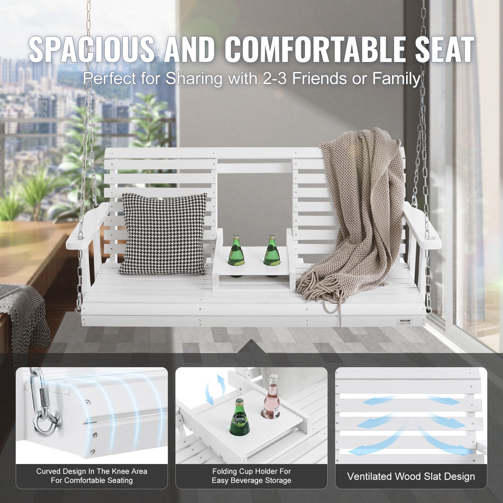Comfortable Enjoyment: Our porch swing is ergonomically designed with a reclined backrest for knee relief. It features a foldable cup holder in the middle, allowing you to conveniently store beverages without taking up seating space when not in use. Adjustable steel chains with safety lock ensure stable suspension for a cozy and relaxing swing experience.