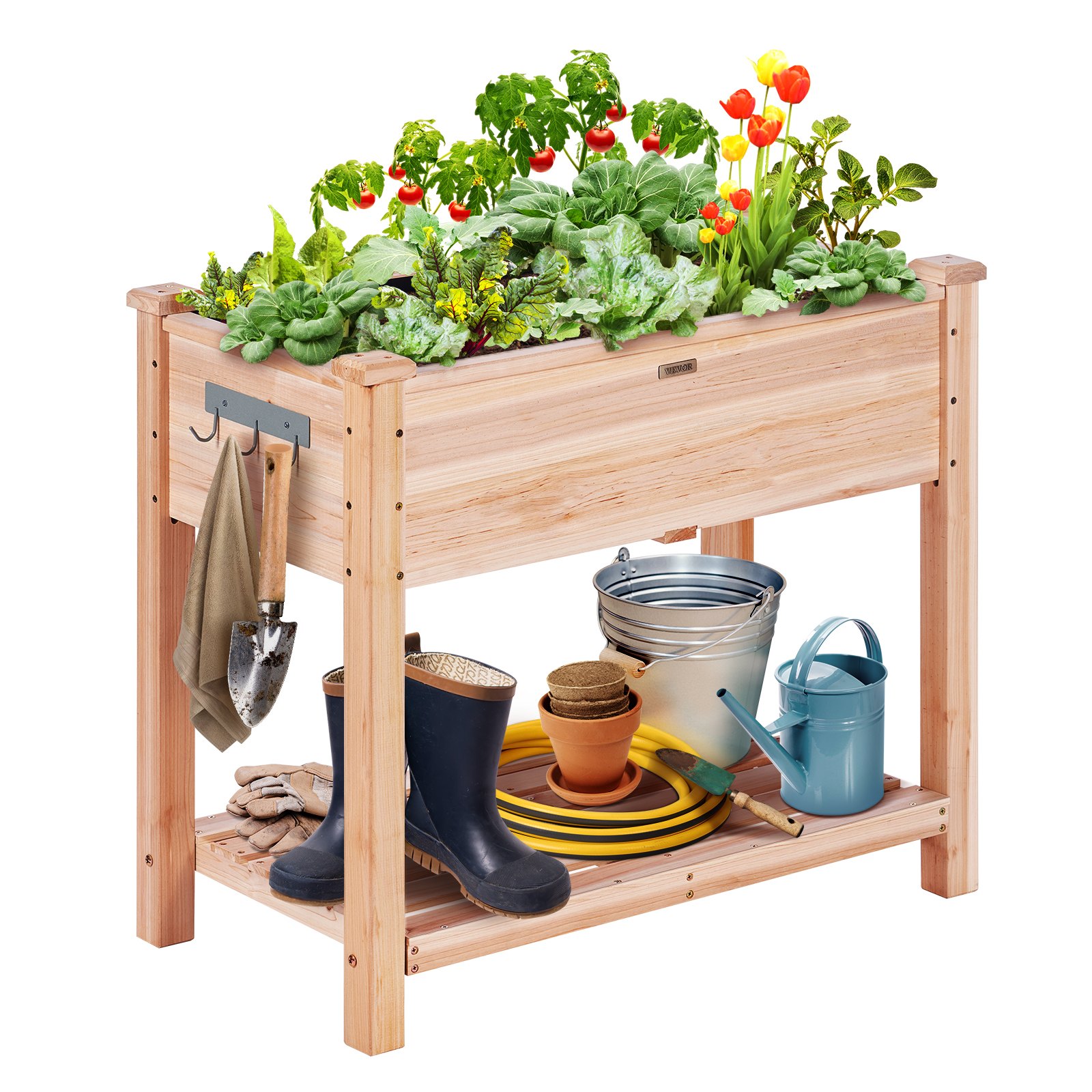 Gardening At Its Finest: This elevated garden bed has 2 tiers for planting and storing. You can plant various vegetables and herbs in the box and store your gardening tools on the lower shelf. Besides, the hooks on the side allow you to hang some small items, making your planting experience more convenient and easier. Get ready to create a garden that your guests and yourself can admire. You will be the talk of the neighborhood.
