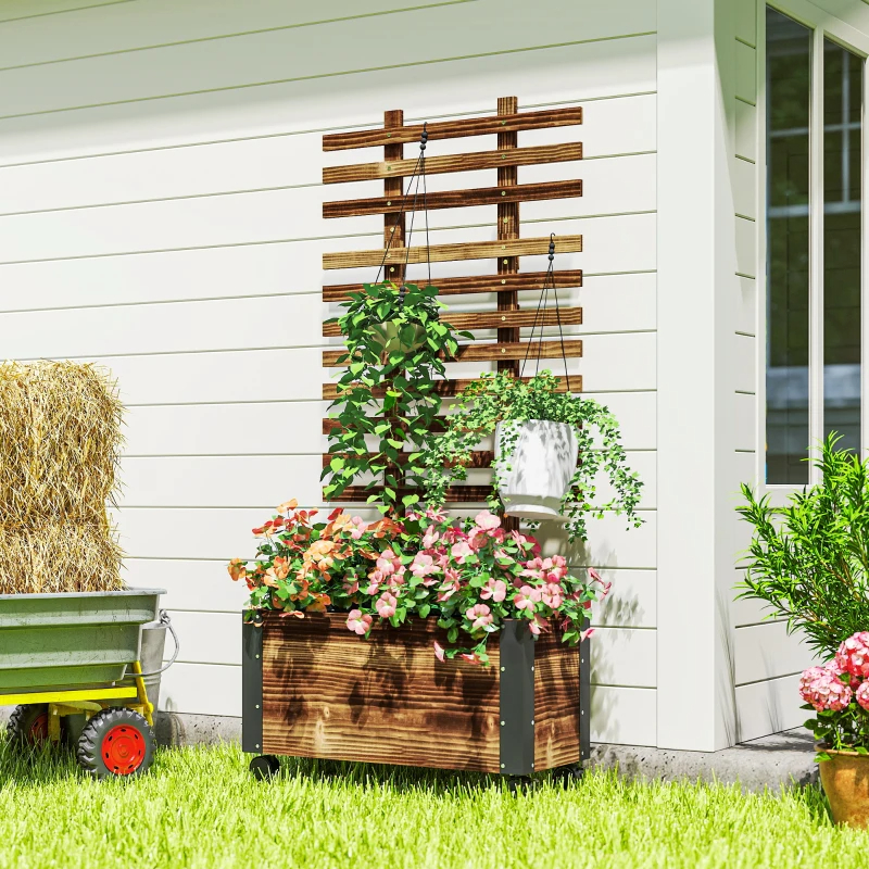 Wooden Raised Garden Bed, Planter Box WTrellis And Metal Corners, Portable On Wheels For Patio, Backyard, Deck, Brown
