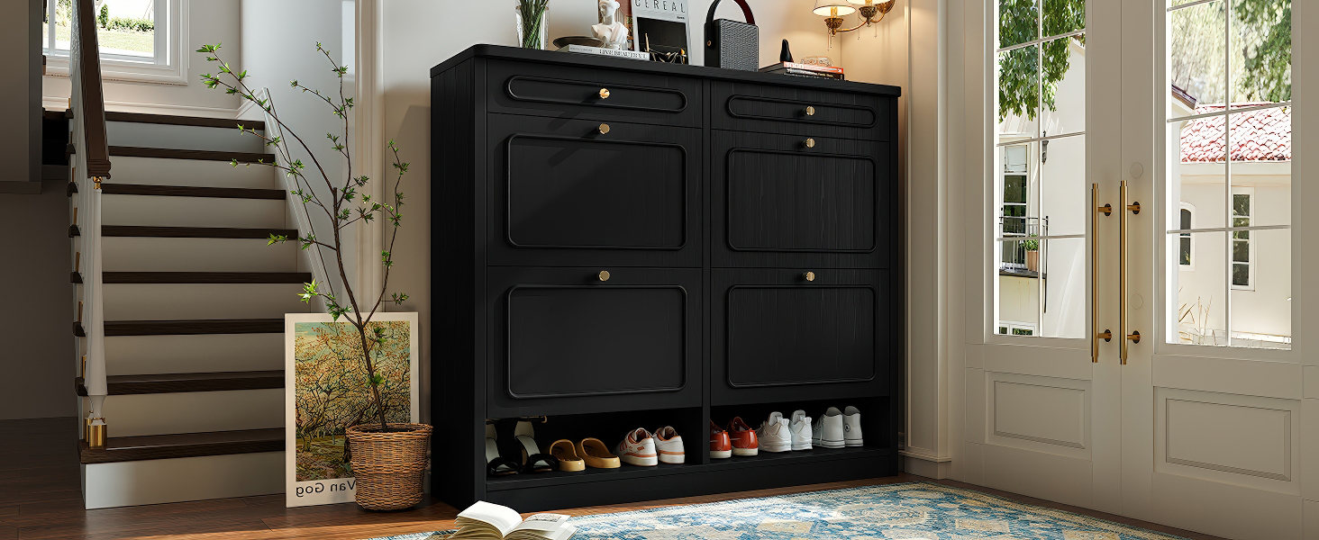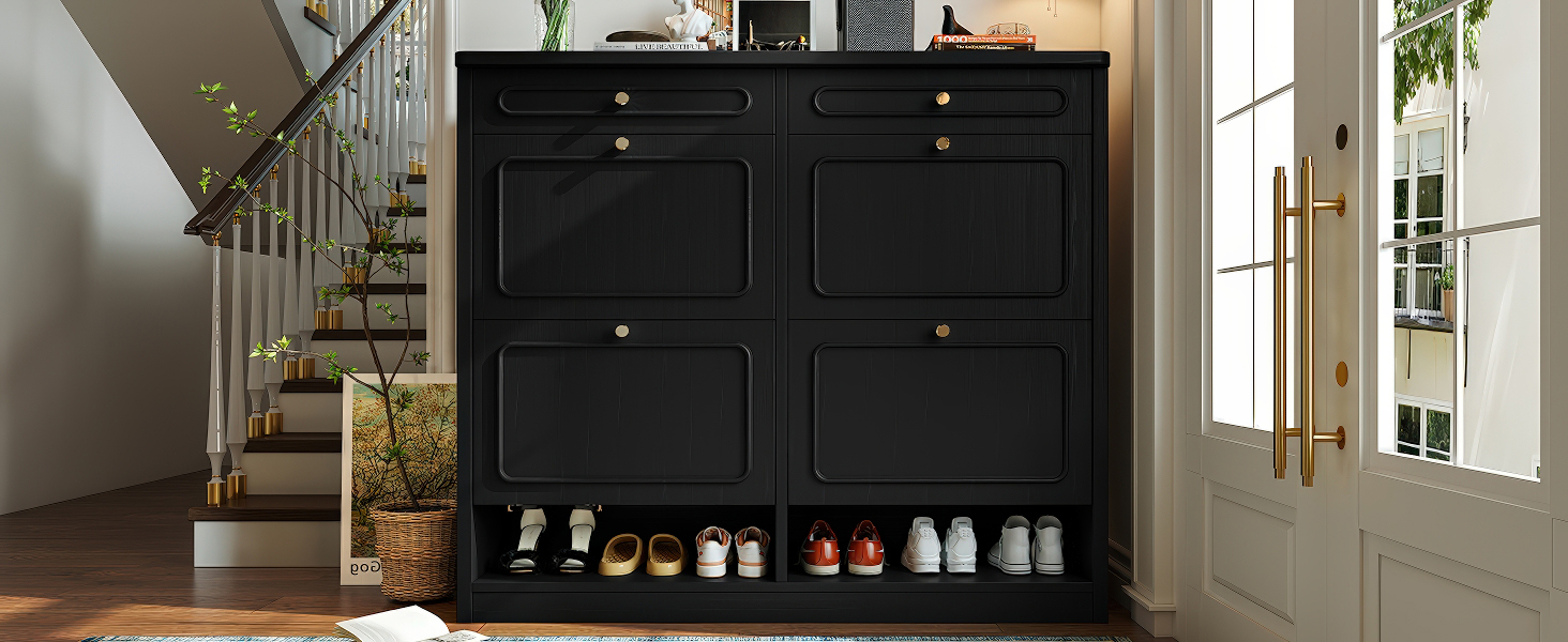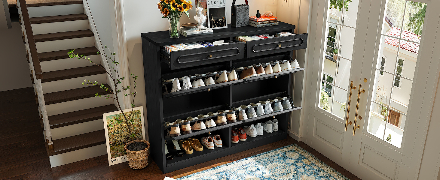 Keep your home organized and stylish with this Wooden Shoe Cabinet with 4 Flip Drawers and 2 Storage Drawers. Designed for modern living, this cabinet offers a smart classified storage solution that hides shoes neatly while keeping essentials within reach. The space-saving flip drawer design allows you to store multiple pairs of shoes without occupying excessive floor space, making it perfect for small apartments, condos or narrow entryways. Two additional top drawers provide convenient storage for everyday items like keys, wallets, shoe care tools or accessories. Finished in a clean farmhouse-style black, this shoe rack cabinet complements a wide range of interior styles—from modern to rustic. Built with sturdy engineered wood, it delivers durability, stability and smooth daily use. Whether placed in your entryway, hallway or bedroom, this functional and elegant shoe cabinet helps create a tidy, welcoming home.