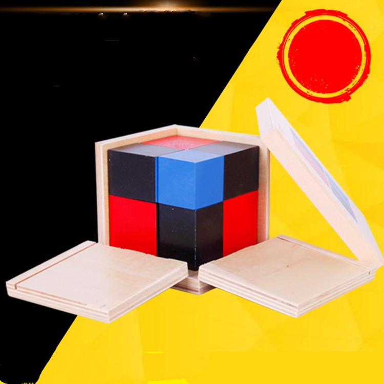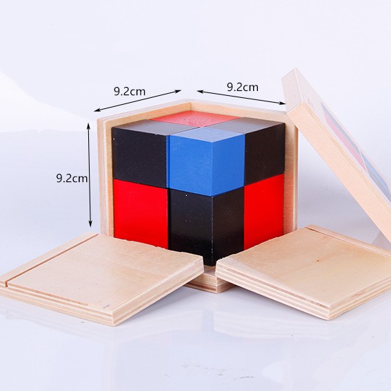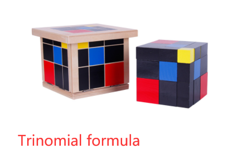 The factors of the equation are represented by the color coded cubes and prisms. Younger children can explore the binomial cube as a sensorial activity of visual discrimination of color and form. This can serve as an indirect preparation for algebra and mathematics