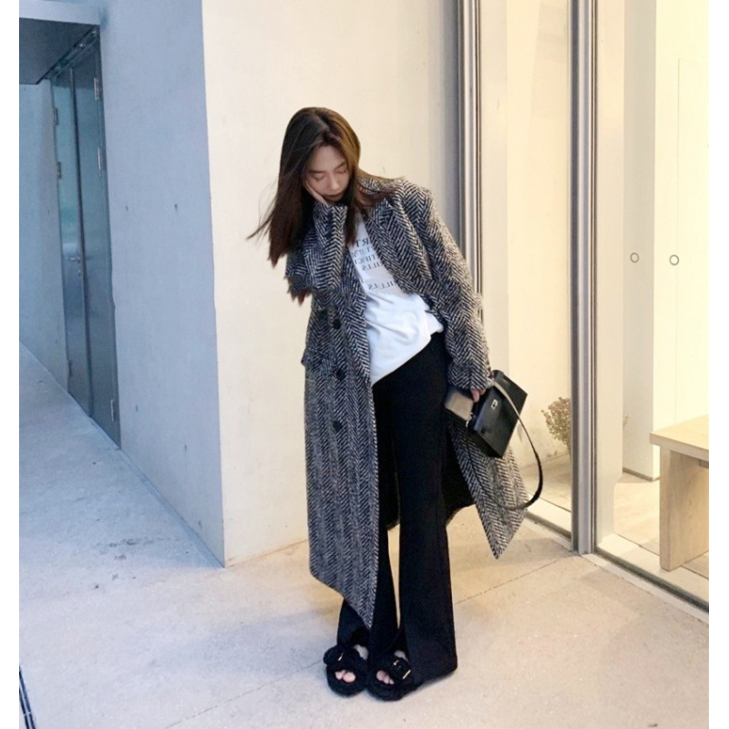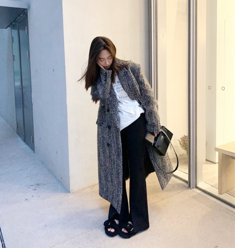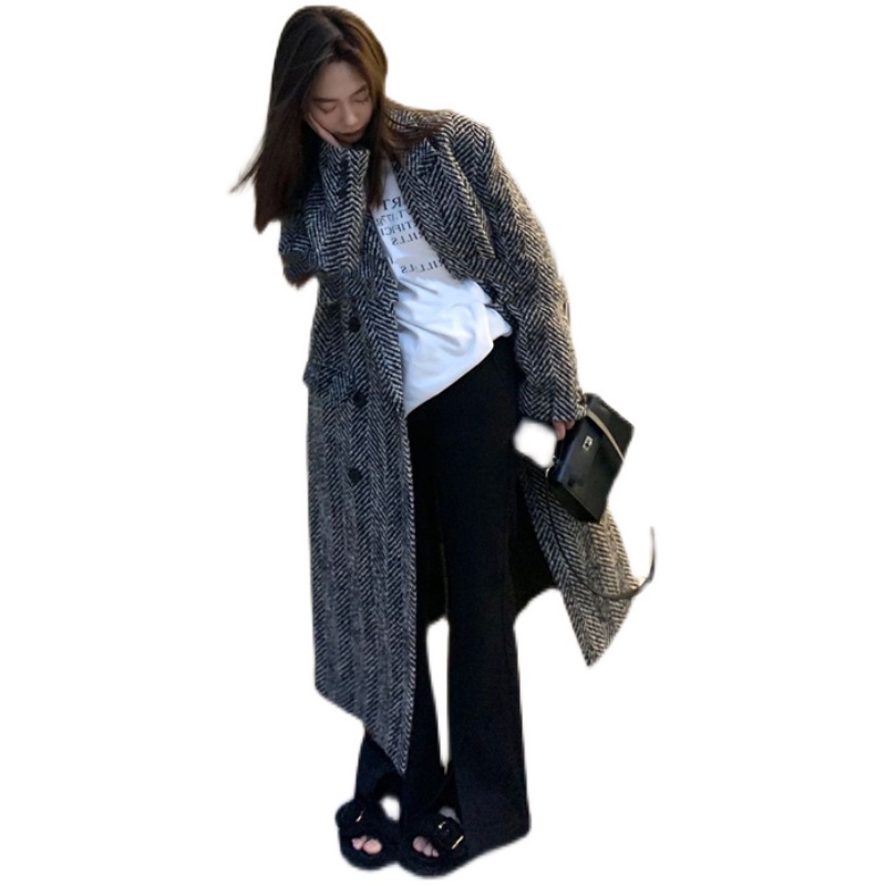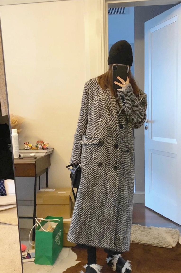 Wool Herringbone Double-breasted Back Slit Thick Woolen Coat Jacket