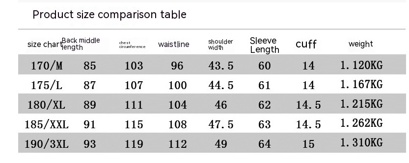 Size: 170/88 (recommend 50-60kg),175/92 (recommend 60-70kg),180/96 (recommend 70-80kg),185/100 (recommend 80-90kg),190/104 (recommend 90-100kg)