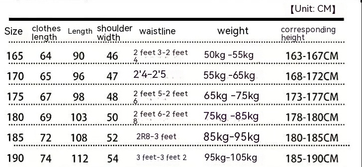 Size: 165 (recommended size: 50.00kg-55.00kg,170 (recommended size: 55.00kg-200kg,175 (recommended size: 200kg-70.00kg,180 (recommended size 70.00kg-80.00kg,185 (recommended size 80.00kg-90.00kg,190 (recommended size 90.00kg-100.00kg