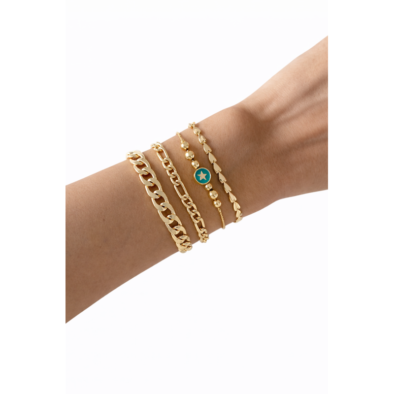 This bracelet set includes four coordinated pieces designed to create a stylish layered look. The star inspired details add a modern and elegant touch that complements both casual and dressy outfits. Each bracelet can be worn together for a complete stacked appearance or individually for a simpler style. The adjustable fit suits most wrist sizes. Material: Base metal iron. Lightweight and comfortable for everyday use. Suitable as a personal accessory or a thoughtful gift choice.