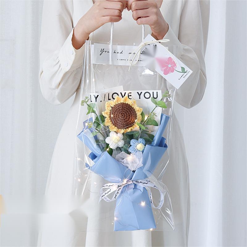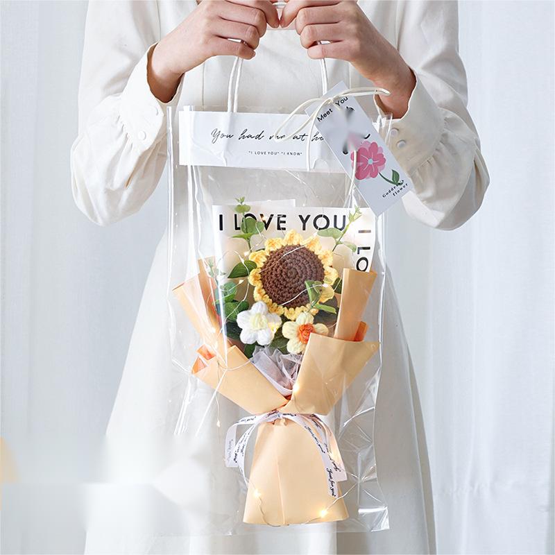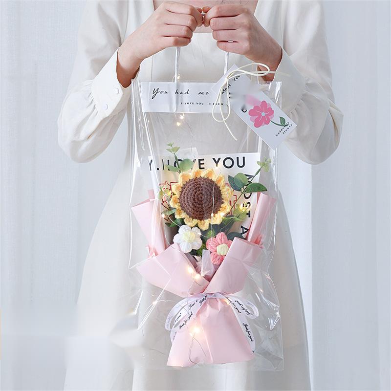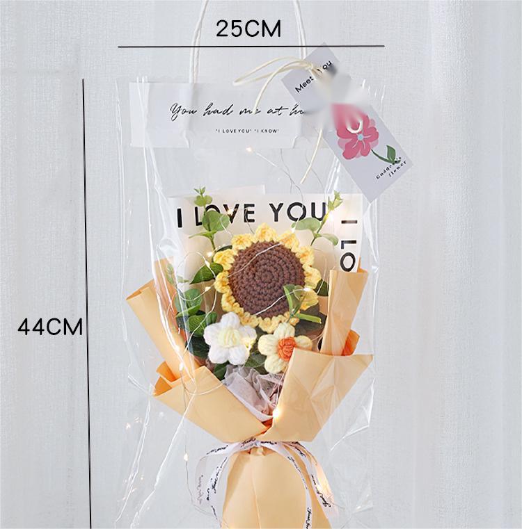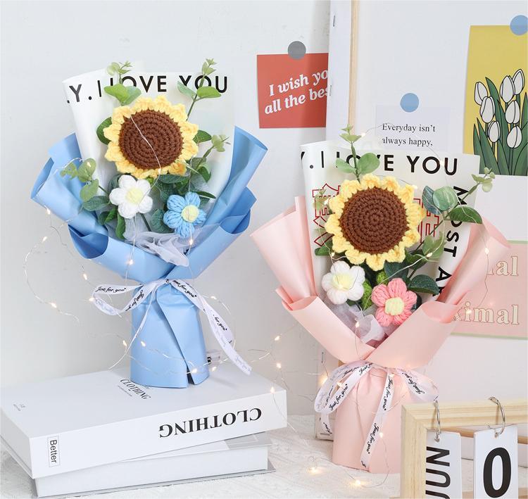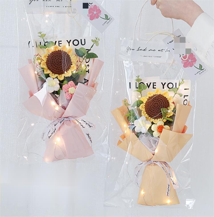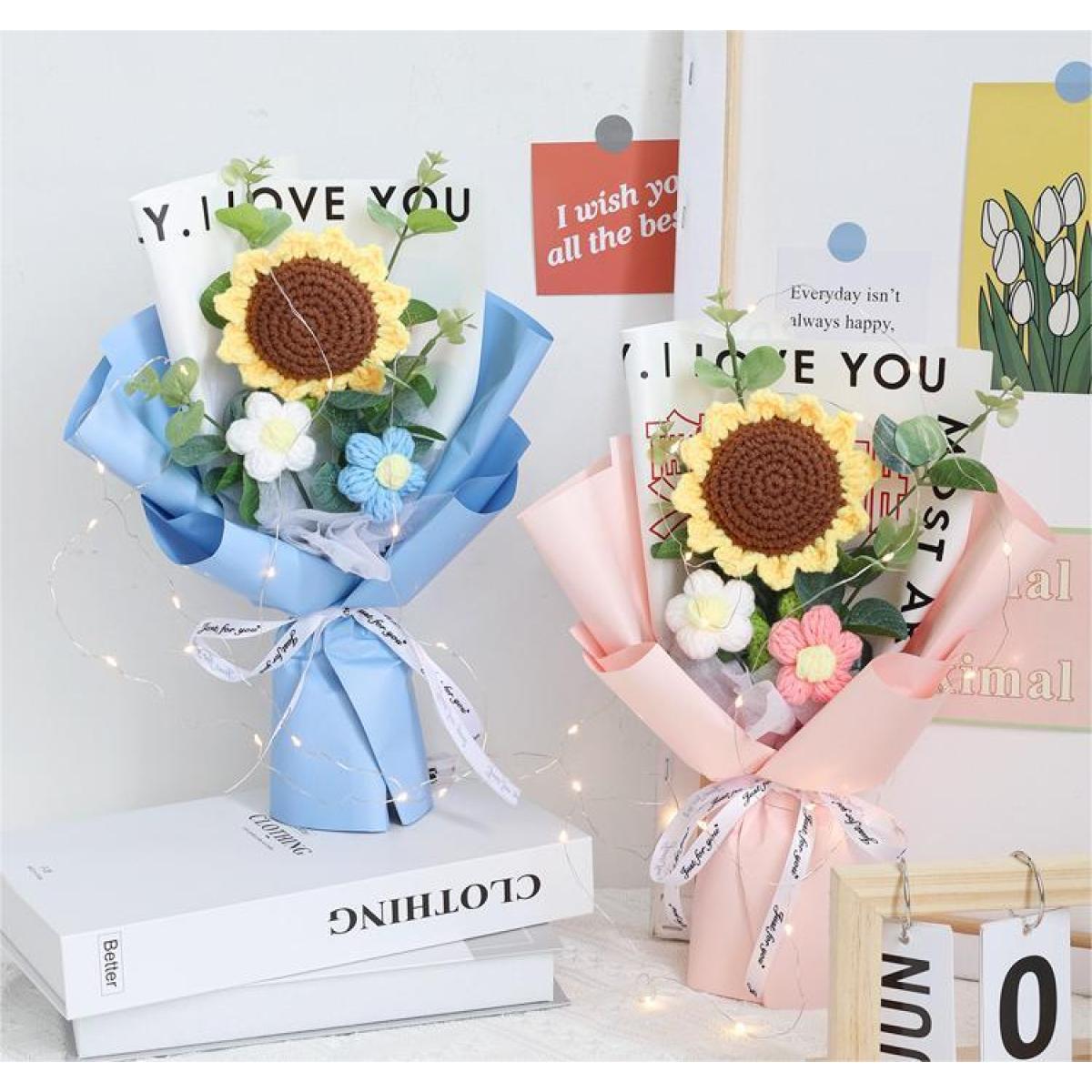 Hand-woven - Hand-woven flowers are brightly colored and look even better when wrapped in a bouquet with green leaves and LED strings.