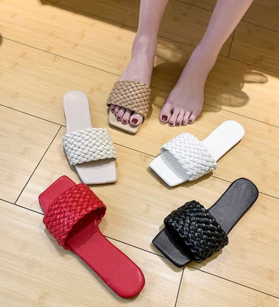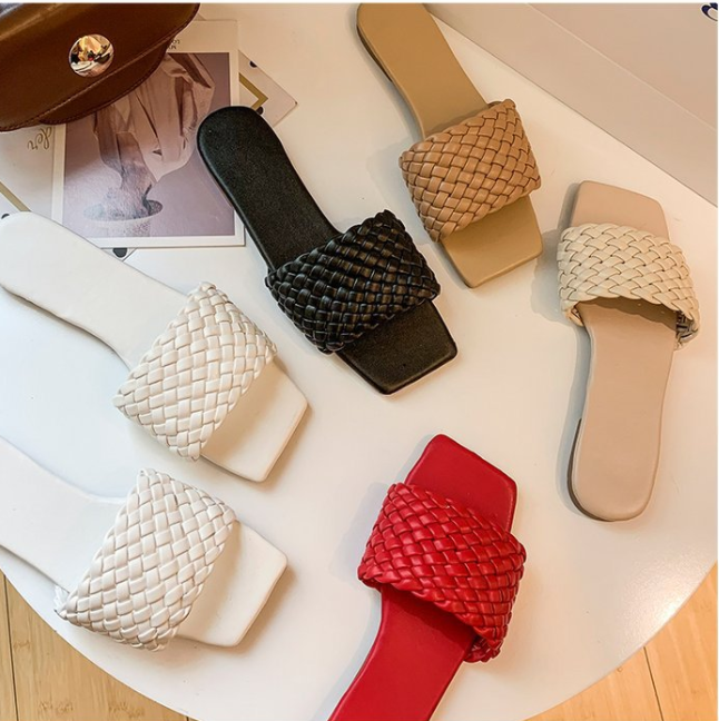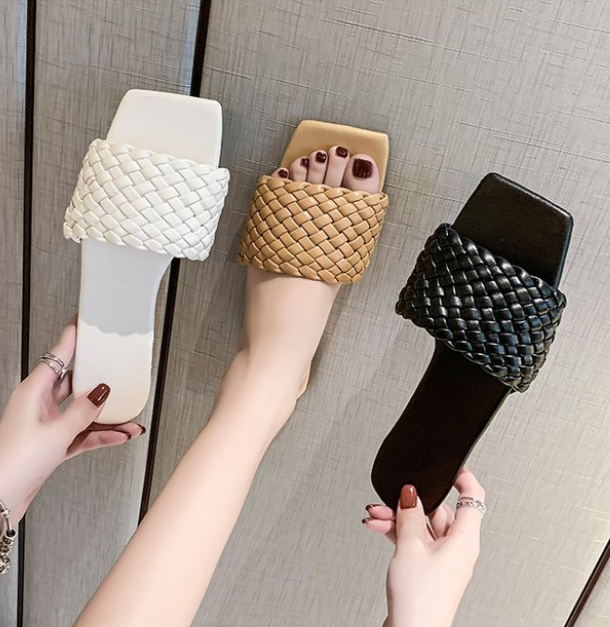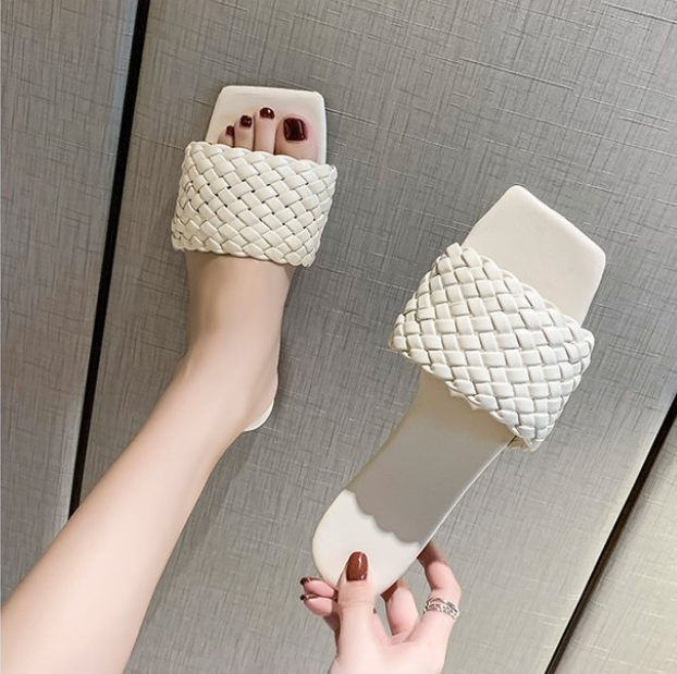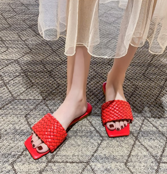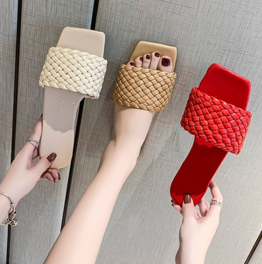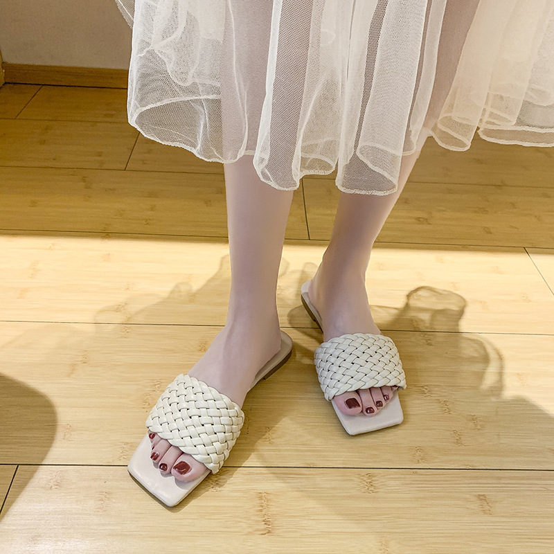 Woven European And American Fine Plaid Square Toe Toe Flat Sandals Women