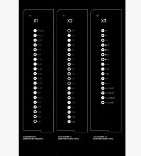 X0 X1 X2 X3 batch head is medium S2 steel. Personal disassembly and adequate household use. In addition, the bottom of the batch head of X0 X1 X2 X3 is a hexagon of 4MM with a length of 28MM, which is a commonly used specification in the screwdriver set of small and medium-sized specifications at present. It can be used with many small and medium size sets. For example, wowstick full series products 1p 1p+ 1F 1FS 1F+ A1 1S can be used for all these models, as well as the market 32, 1, 33, 1, 45, 1, 58, 1 and south flag 22 in one and 28 in one. The bottom size is the same 4MM hexagon.