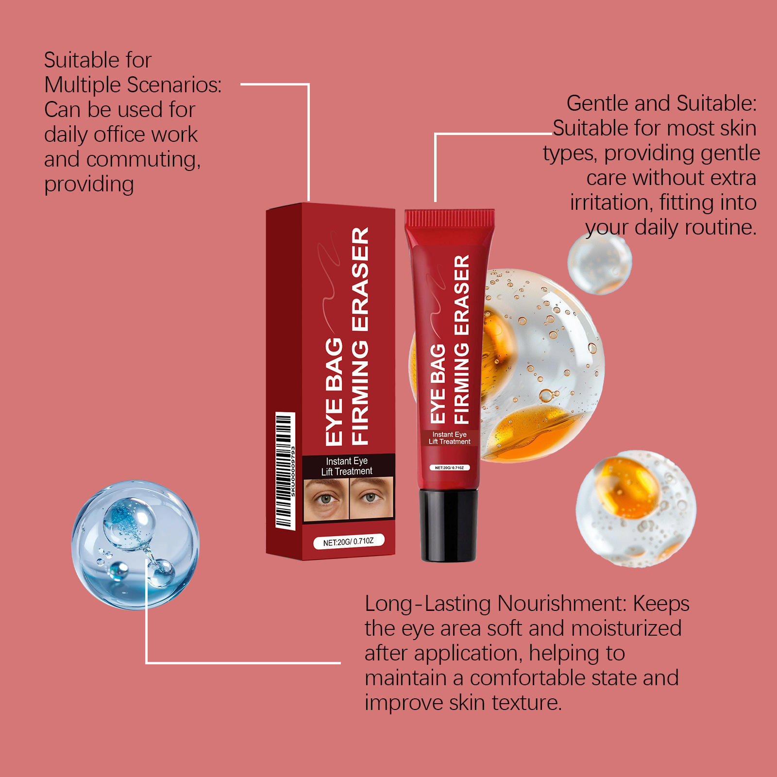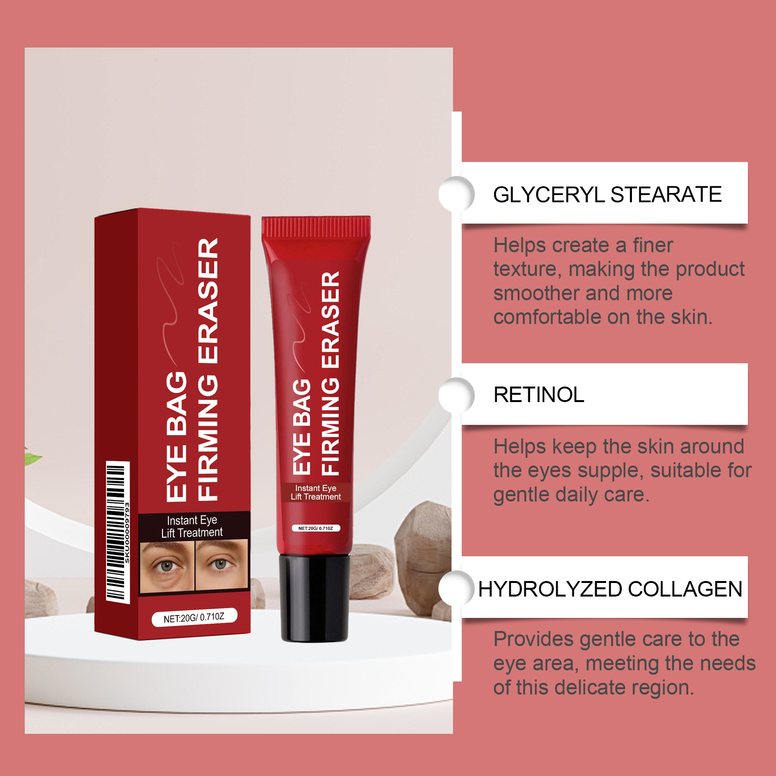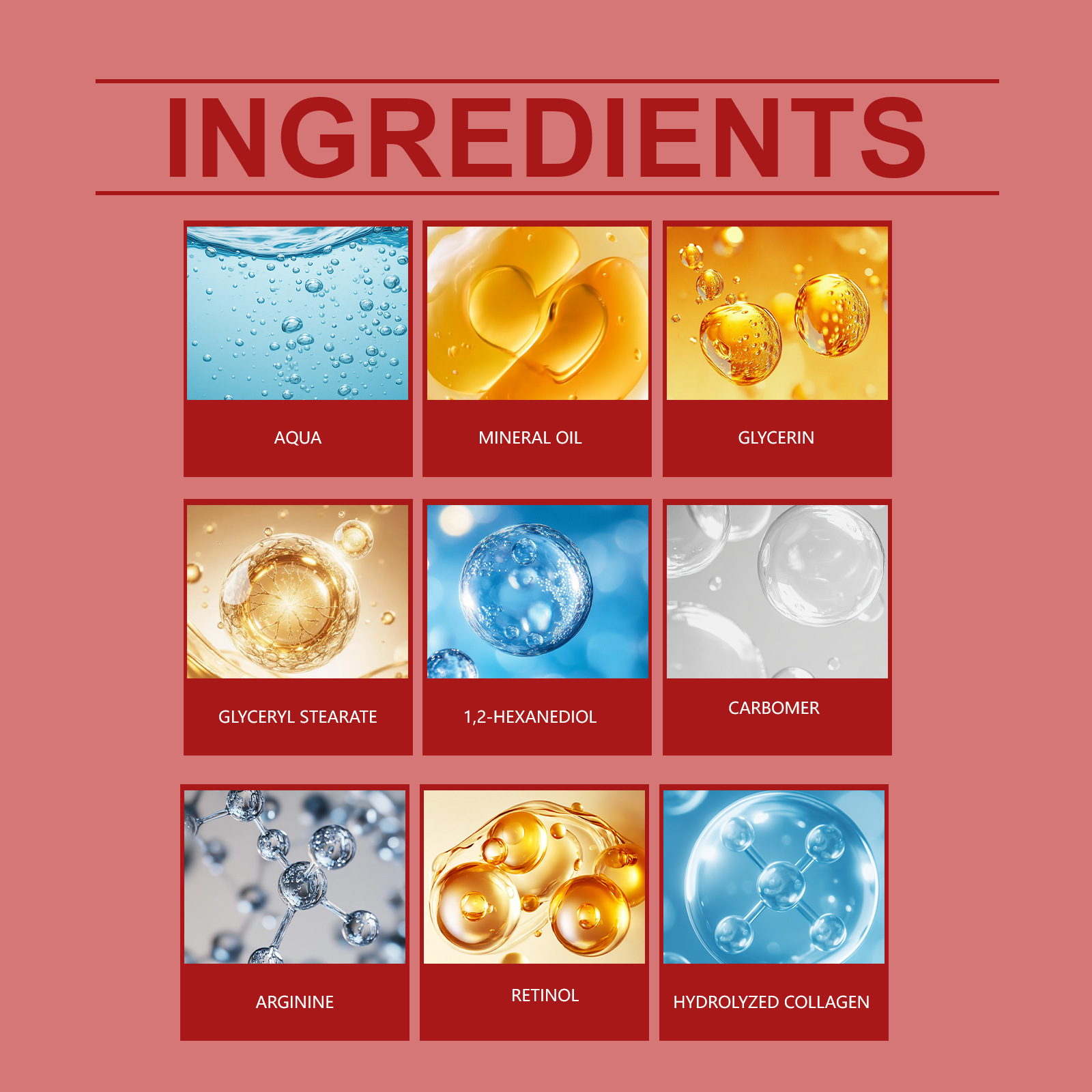 Ingredients: water, mineral oil, glycerin, glycerol stearate, 1,2- hexanediol, carbomer, arginine, retinol, hydrolyzed collagen.