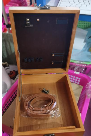 Hung over the shoulder to engage the leather inner strap when opening the box.