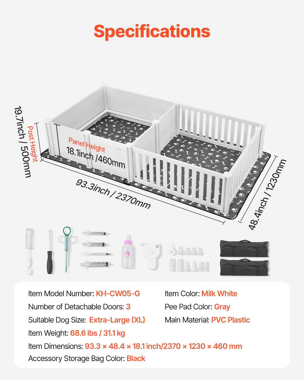 Geeignete Hundegrö_e: Extragro_ (XL), Artikelabmessungen: 93,3 x 48,4 x 18,1 Zoll / 2370 x 1230 x 460 mm, Farbe der Pipi-Unterlage: Grau, Hauptmaterial: PVC-Kunststoff,Artikelmodellnummer: KH-CW05-G, Artikelfarbe: Milchwei_, Anzahl der abnehmbaren Türen: 3, Artikelgewicht: 68,6 lbs / 31,1 kg, Zubehör-Aufbewahrungstasche, Farbe: Schwarz