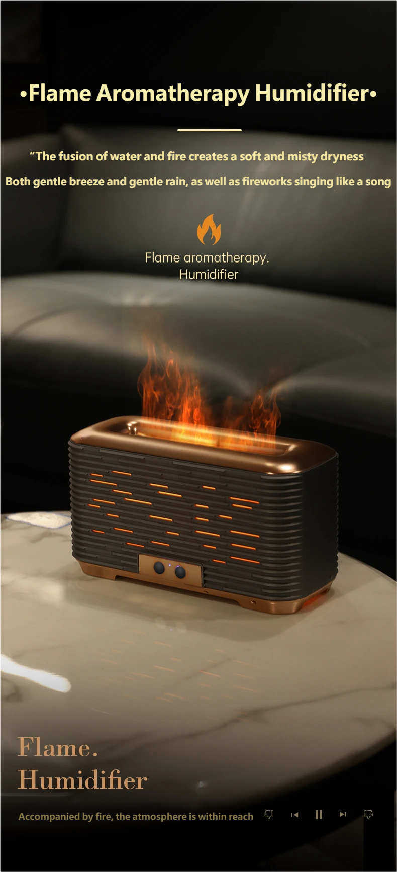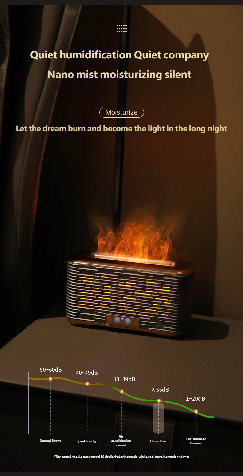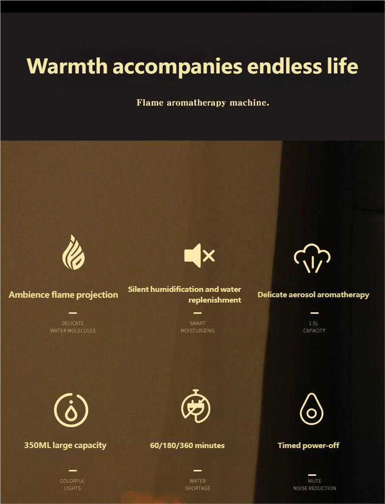 Realistic Flame Projection & Atmosphere: The first-of-its-kind flame projection effect, with 2 light colors (cool/warm) to switch, creates a warm, romantic, or mysterious atmosphere. It's a humidifier and ambient lamp in one, elevating your daily life style.