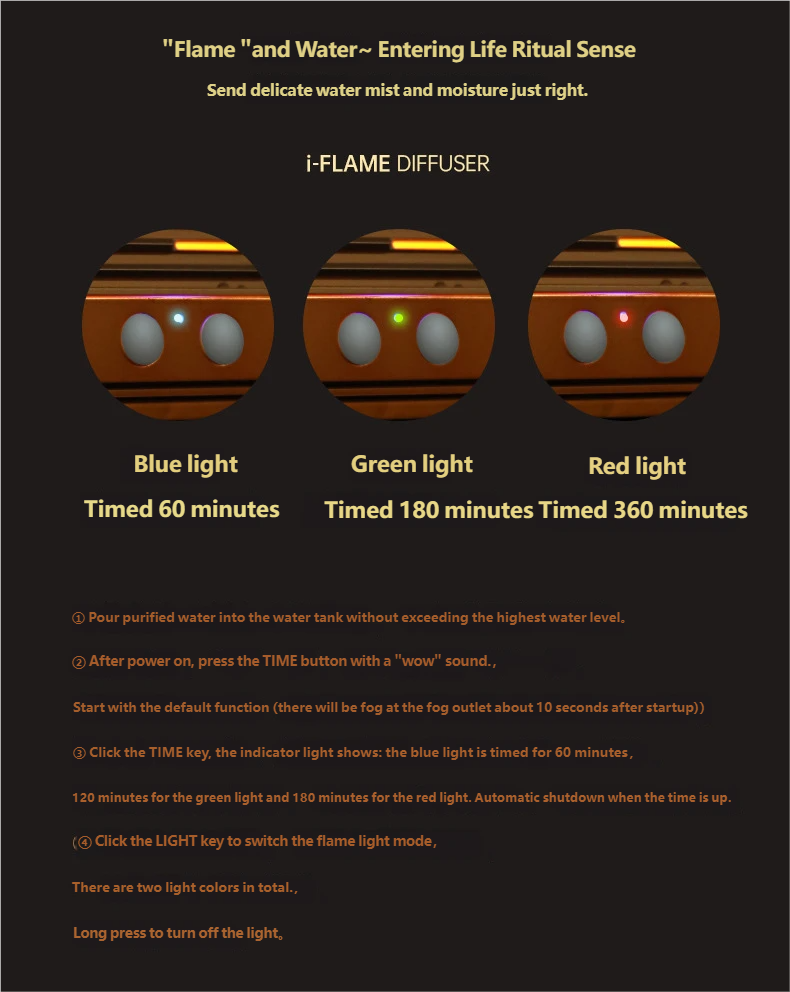 Press the LIGHT button to switch flame light modes (2 light colors), long-press to turn off the light.