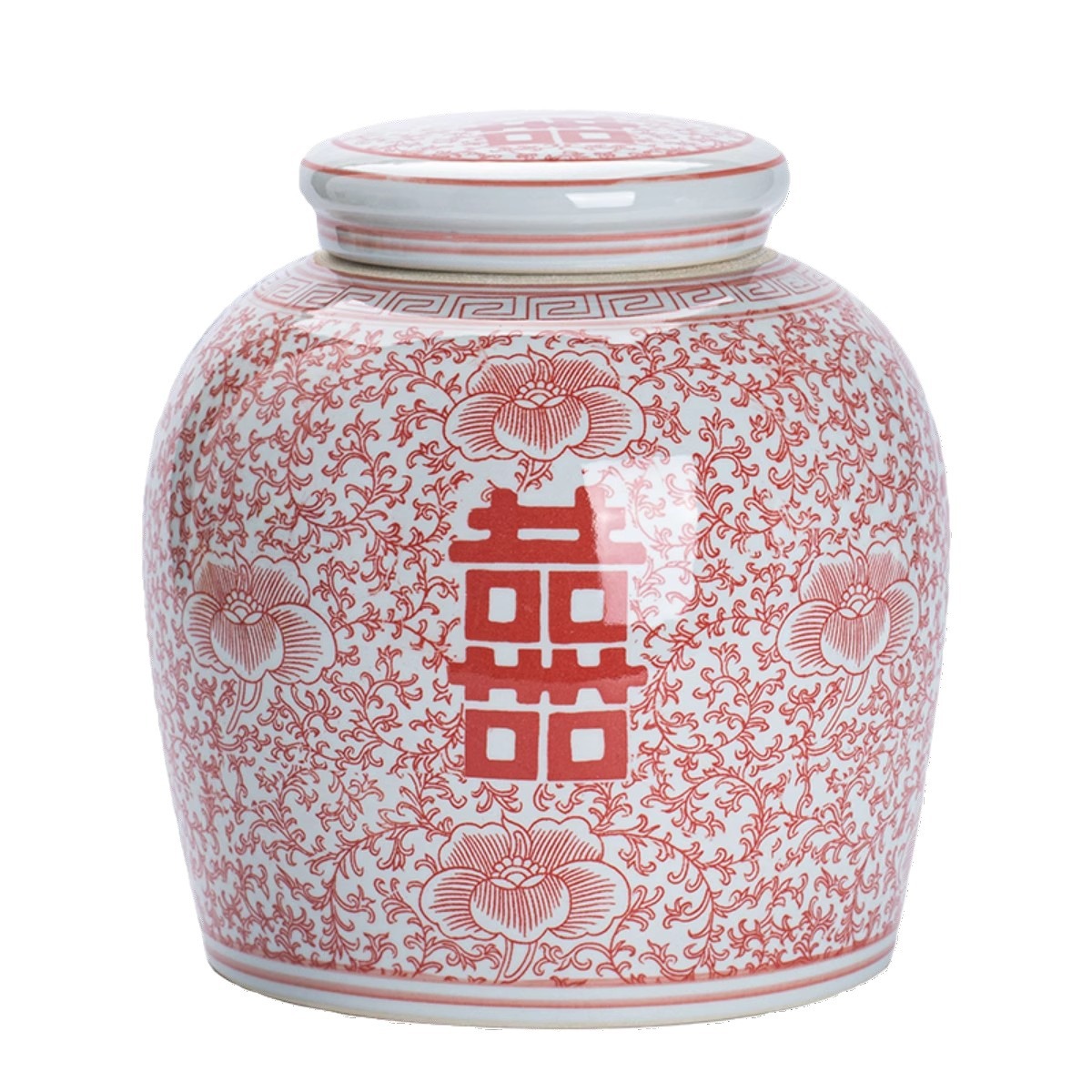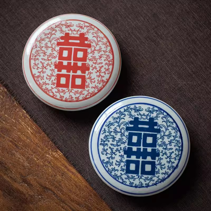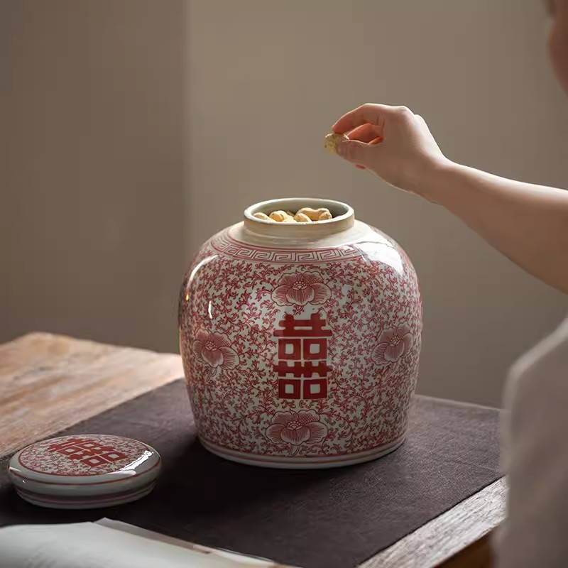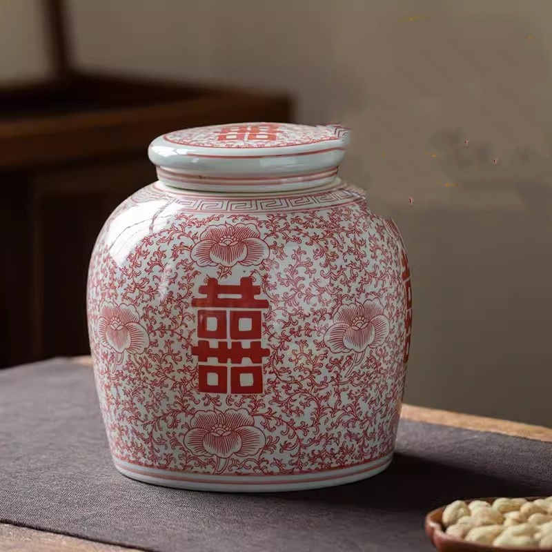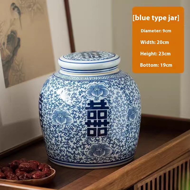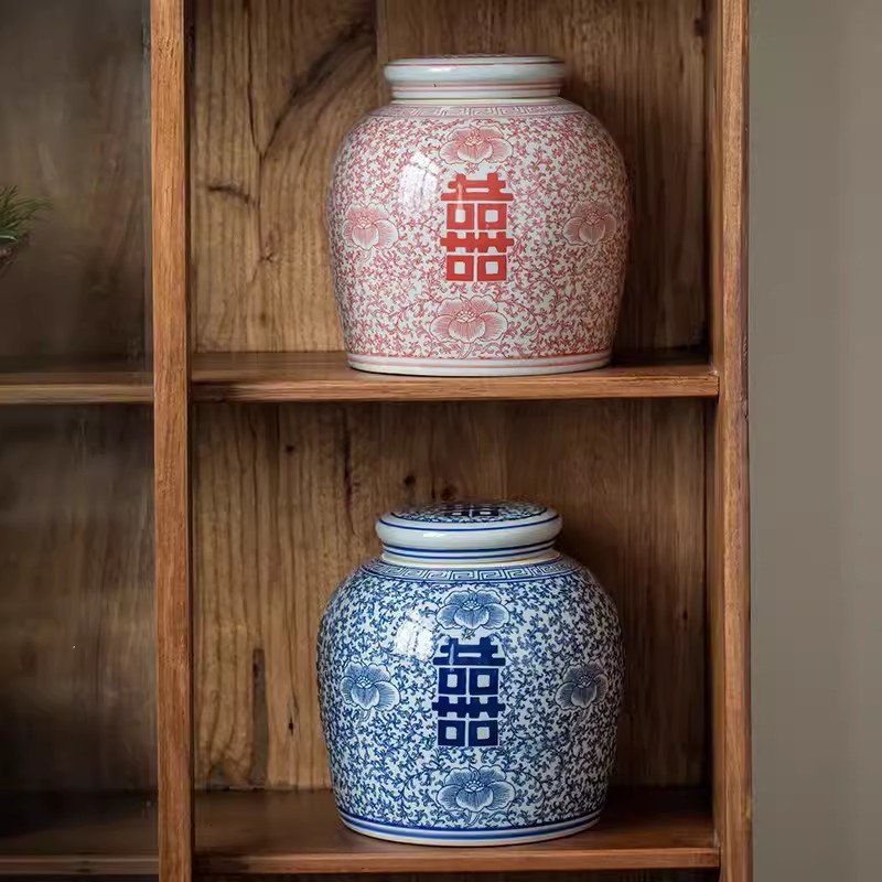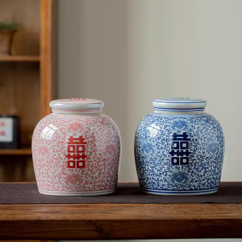 Product information:Material: Ceramic Size: blue and white Xi word jar, red Xi character cans Style: Chinese style Category: Vase