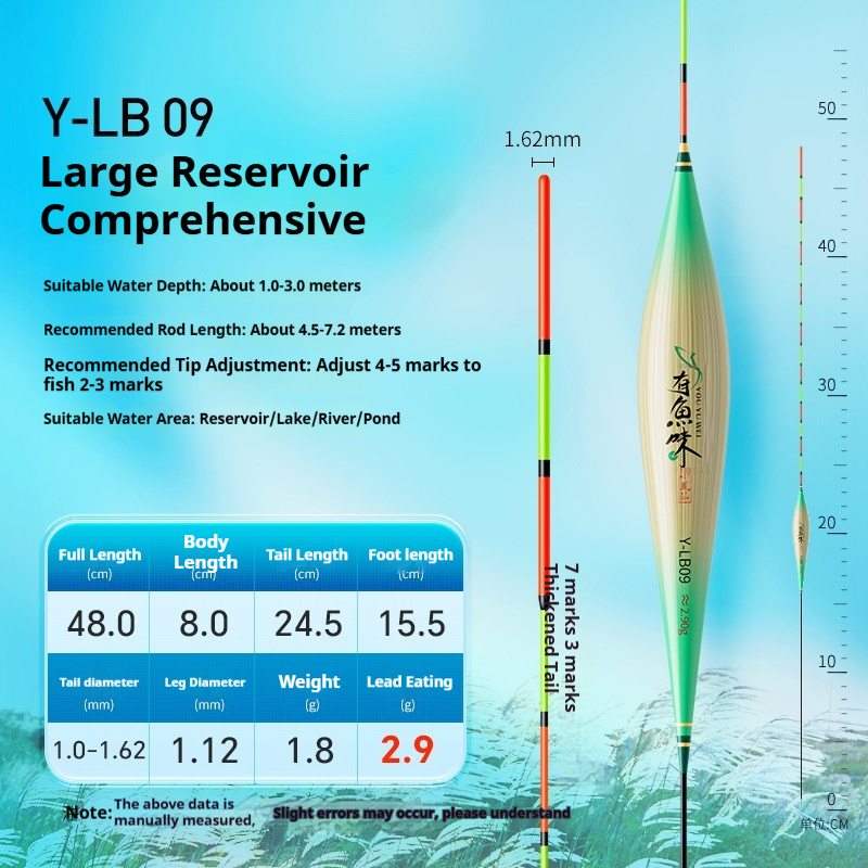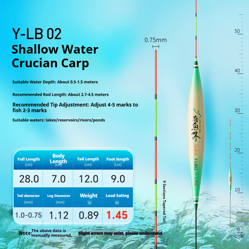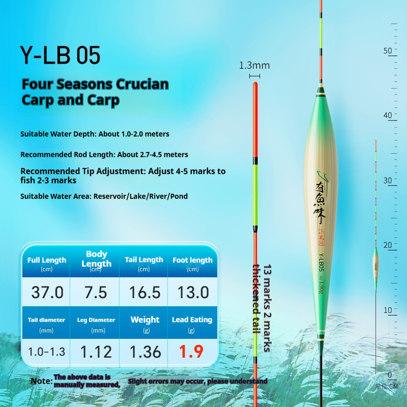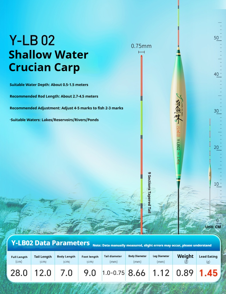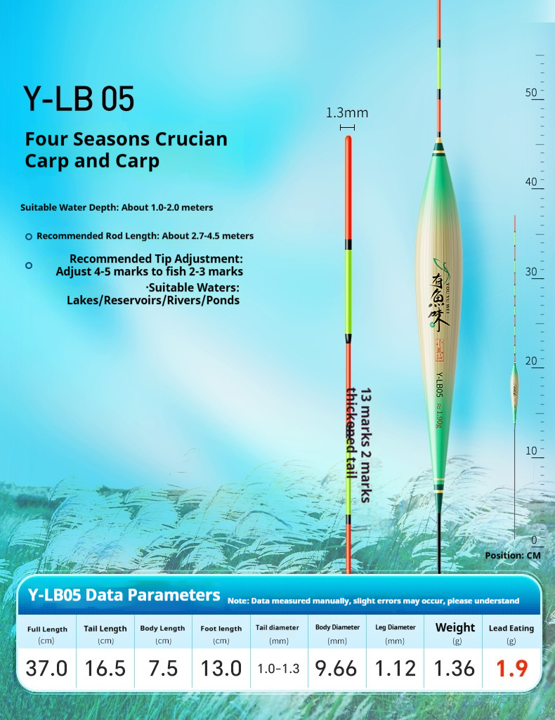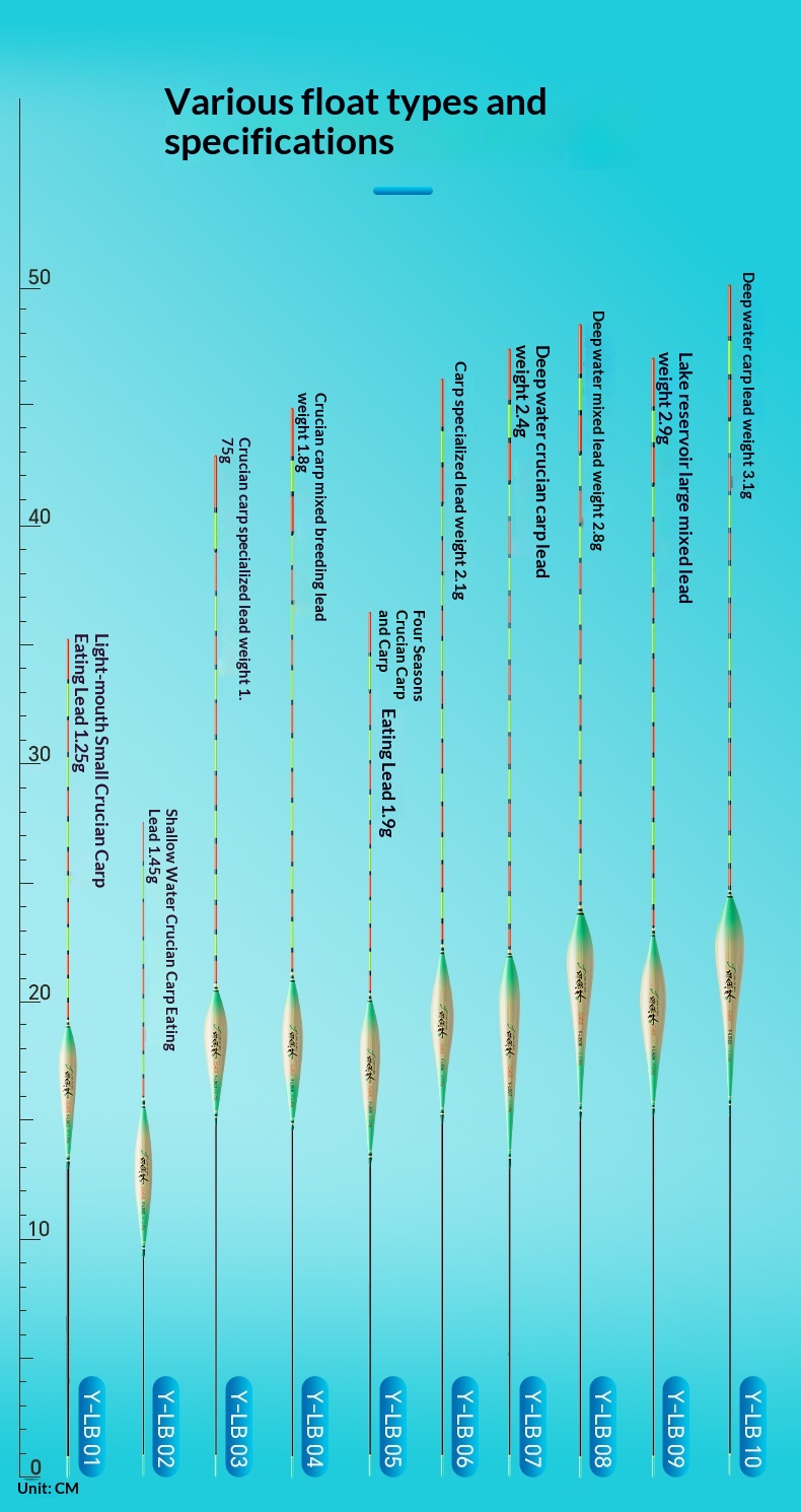 Specifications: Y-LB01, 36 cm long, with a lead load of approximately 1.25 g, designed for finicky small crucian carp, featuring a 13-section rod with a thickened tip section; Y-LB02, 28 cm long, with a lead load of approximately 1.45 g, suitable for shallow-water crucian carp fishing, with a 9-section rod and a gradually tapering tip; Y-LB03, 44 cm long, with a lead load of approximately 1.75 g, specifically for crucian carp, featuring a 15-section rod with a thickened tip section; Y-LB04, 46 cm long, with a lead load of approximately 1.80 g, ideal for mixed carp and crucian carp ponds, with a 17-section rod and three thickened sections at the tip; Y-LB05, 37 cm long, with a lead load of approximately 1.90 g, suitable for year-round carp and crucian carp fishing, featuring a 13-section rod with two thickened sections at the tip; Y-LB06, 47 cm long, with a lead load of approximately 2.10 g, specialized for carp, with a 17-section rod and three thickened sections at the tip; Y-LB07, 48.5 cm long, with a lead load of approximately 2.40 g, designed for deep-water carp and crucian carp, with a 17-section rod and three thickened sections at the tip; Y-LB08, 49 cm long, with a lead load of approximately 2.80 g, a versatile deep-water rig with a 17-section rod and three thickened sections at the tip; Y-LB09, 48 cm long, with a lead load of approximately 2.90 g, a large-lake/ reservoir all-purpose rig with a 17-section rod and three thickened sections at the tip; Y-LB10, 50 cm long, with a lead load of approximately 3.10 g, ideal for deep-water carp fishing, featuring a 17-section rod and three thickened sections at the tip; Y-LB11, 44 cm long, with a lead load of approximately 1.40 g, suitable for travel fishing targeting whitebait and mandarin fish, with a 15-section rod that tapers toward the tip; Y-LB12, 48 cm long, with a lead load of approximately 2.0 g, a bottom-fishing all-purpose rig with a 17-section rod and two thickened sections at the tip; T-LC08, with a lead load of approximately 2.40 g, a shallow-water all-purpose rig; T-LC09, with a lead load of approximately 2.80 g, also a shallow-water all-purpose rig.