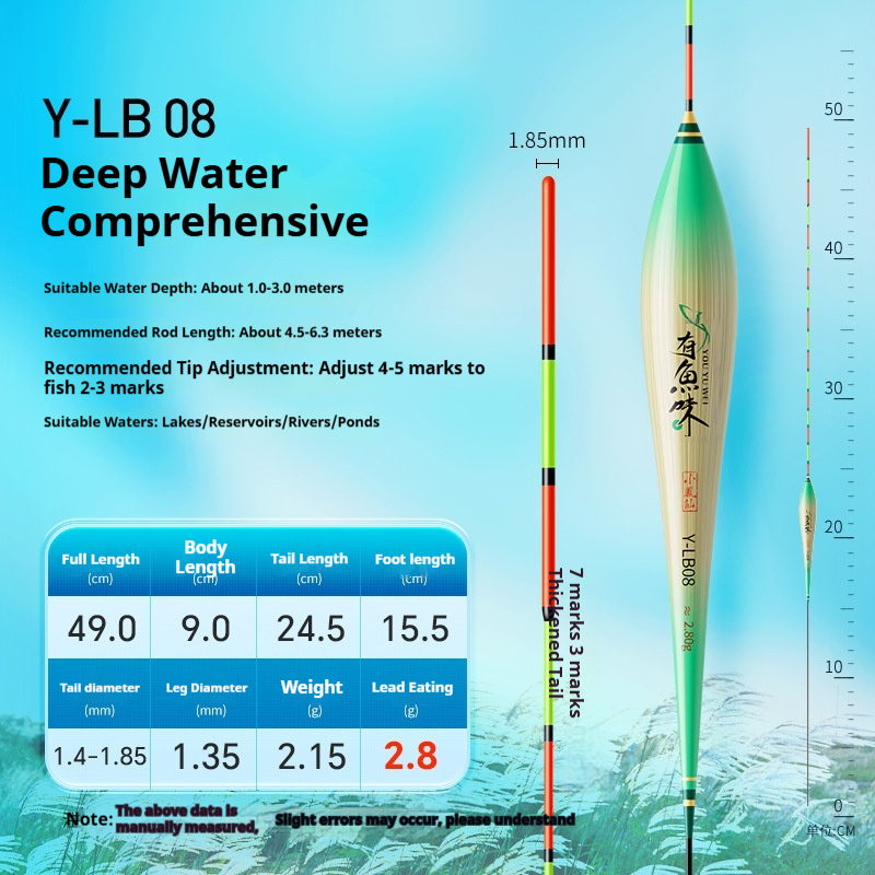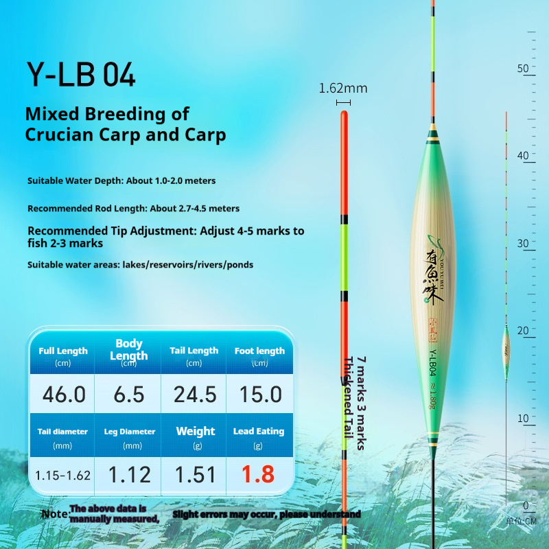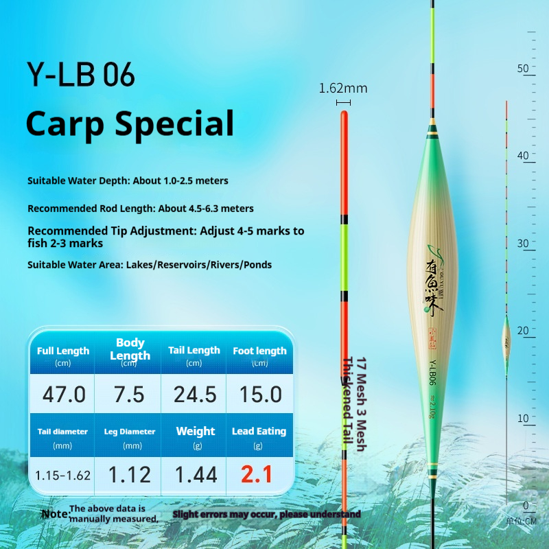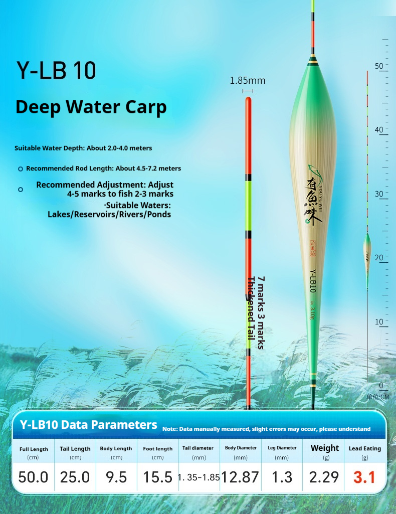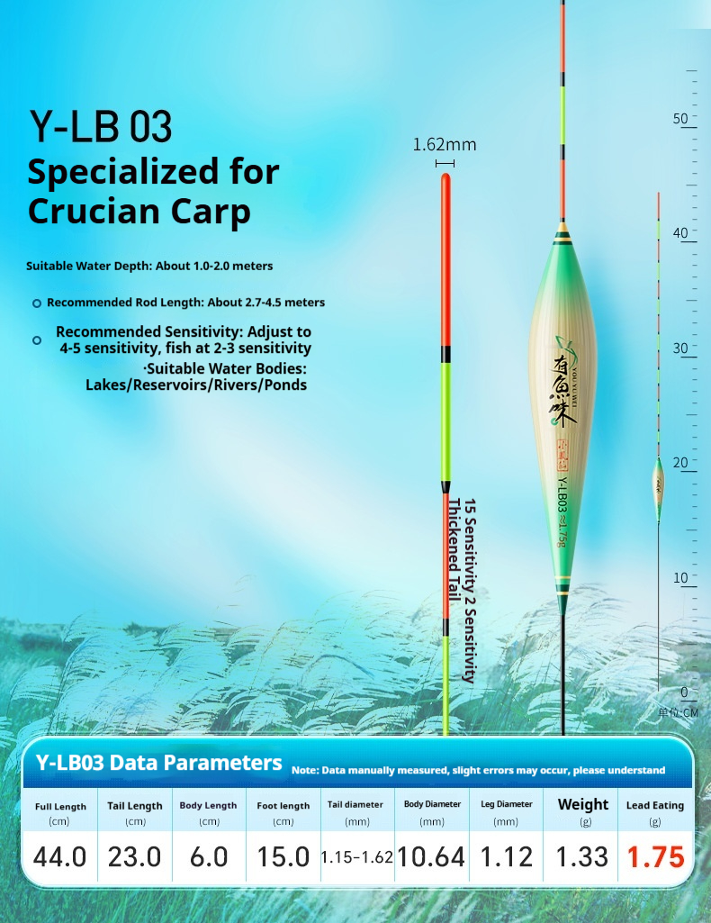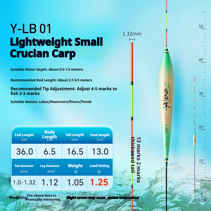 Specifications: Y-LB01, 36 cm long, with a lead load of approximately 1.25 g, designed for finicky small crucian carp, featuring a 13-section rod with a thickened tip section; Y-LB02, 28 cm long, with a lead load of approximately 1.45 g, suitable for shallow-water crucian carp fishing, with a 9-section rod and a gradually tapering tip; Y-LB03, 44 cm long, with a lead load of approximately 1.75 g, specifically for crucian carp, featuring a 15-section rod with a thickened tip section; Y-LB04, 46 cm long, with a lead load of approximately 1.80 g, ideal for mixed carp and crucian carp ponds, with a 17-section rod and three thickened sections at the tip; Y-LB05, 37 cm long, with a lead load of approximately 1.90 g, suitable for year-round carp and crucian carp fishing, featuring a 13-section rod with two thickened sections at the tip; Y-LB06, 47 cm long, with a lead load of approximately 2.10 g, specialized for carp, with a 17-section rod and three thickened sections at the tip; Y-LB07, 48.5 cm long, with a lead load of approximately 2.40 g, designed for deep-water carp and crucian carp, with a 17-section rod and three thickened sections at the tip; Y-LB08, 49 cm long, with a lead load of approximately 2.80 g, a versatile deep-water rig with a 17-section rod and three thickened sections at the tip; Y-LB09, 48 cm long, with a lead load of approximately 2.90 g, a large-lake/ reservoir all-purpose rig with a 17-section rod and three thickened sections at the tip; Y-LB10, 50 cm long, with a lead load of approximately 3.10 g, ideal for deep-water carp fishing, featuring a 17-section rod and three thickened sections at the tip; Y-LB11, 44 cm long, with a lead load of approximately 1.40 g, suitable for travel fishing targeting whitebait and mandarin fish, with a 15-section rod that tapers toward the tip; Y-LB12, 48 cm long, with a lead load of approximately 2.0 g, a bottom-fishing all-purpose rig with a 17-section rod and two thickened sections at the tip; T-LC08, with a lead load of approximately 2.40 g, a shallow-water all-purpose rig; T-LC09, with a lead load of approximately 2.80 g, also a shallow-water all-purpose rig.