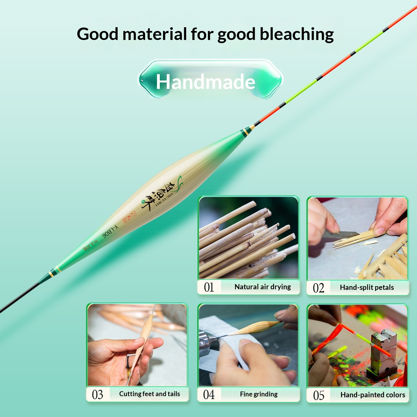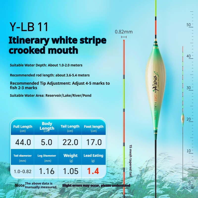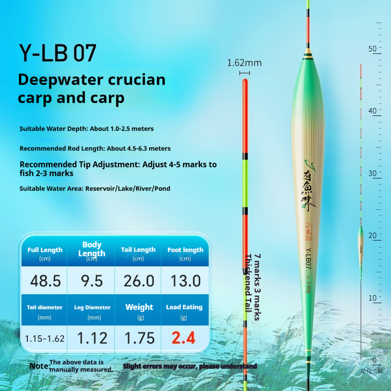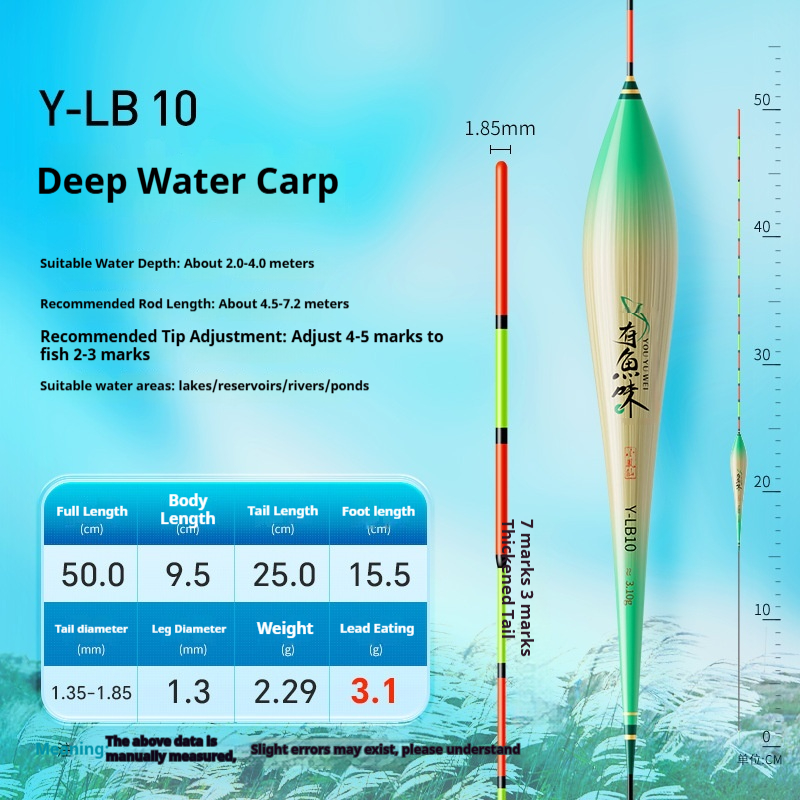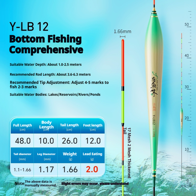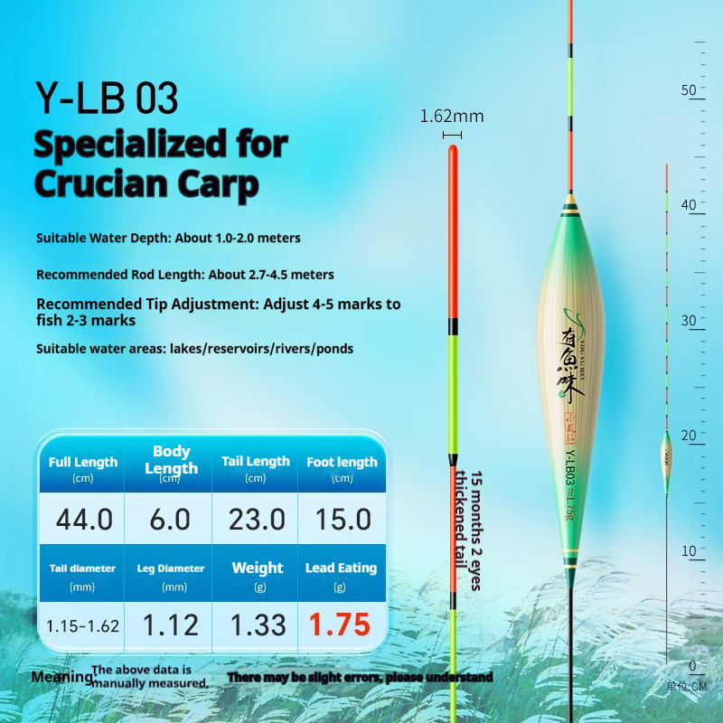 Specifications: Y-LB01, 36 cm long, with a lead load of approximately 1.25 g, designed for finicky small crucian carp, featuring a 13-section rod with a thickened tip section; Y-LB02, 28 cm long, with a lead load of approximately 1.45 g, suitable for shallow-water crucian carp fishing, with a 9-section rod and a gradually tapering tip; Y-LB03, 44 cm long, with a lead load of approximately 1.75 g, specifically for crucian carp, featuring a 15-section rod with a thickened tip section; Y-LB04, 46 cm long, with a lead load of approximately 1.80 g, ideal for mixed carp and crucian carp ponds, with a 17-section rod and three thickened sections at the tip; Y-LB05, 37 cm long, with a lead load of approximately 1.90 g, suitable for year-round carp and crucian carp fishing, featuring a 13-section rod with two thickened sections at the tip; Y-LB06, 47 cm long, with a lead load of approximately 2.10 g, specialized for carp, with a 17-section rod and three thickened sections at the tip; Y-LB07, 48.5 cm long, with a lead load of approximately 2.40 g, designed for deep-water carp and crucian carp, with a 17-section rod and three thickened sections at the tip; Y-LB08, 49 cm long, with a lead load of approximately 2.80 g, a versatile deep-water rig with a 17-section rod and three thickened sections at the tip; Y-LB09, 48 cm long, with a lead load of approximately 2.90 g, a large-lake/ reservoir all-purpose rig with a 17-section rod and three thickened sections at the tip; Y-LB10, 50 cm long, with a lead load of approximately 3.10 g, ideal for deep-water carp fishing, featuring a 17-section rod and three thickened sections at the tip; Y-LB11, 44 cm long, with a lead load of approximately 1.40 g, suitable for travel fishing targeting whitebait and mandarin fish, with a 15-section rod that tapers toward the tip; Y-LB12, 48 cm long, with a lead load of approximately 2.0 g, a bottom-fishing all-purpose rig with a 17-section rod and two thickened sections at the tip; T-LC08, with a lead load of approximately 2.40 g, a shallow-water all-purpose rig; T-LC09, with a lead load of approximately 2.80 g, also a shallow-water all-purpose rig.