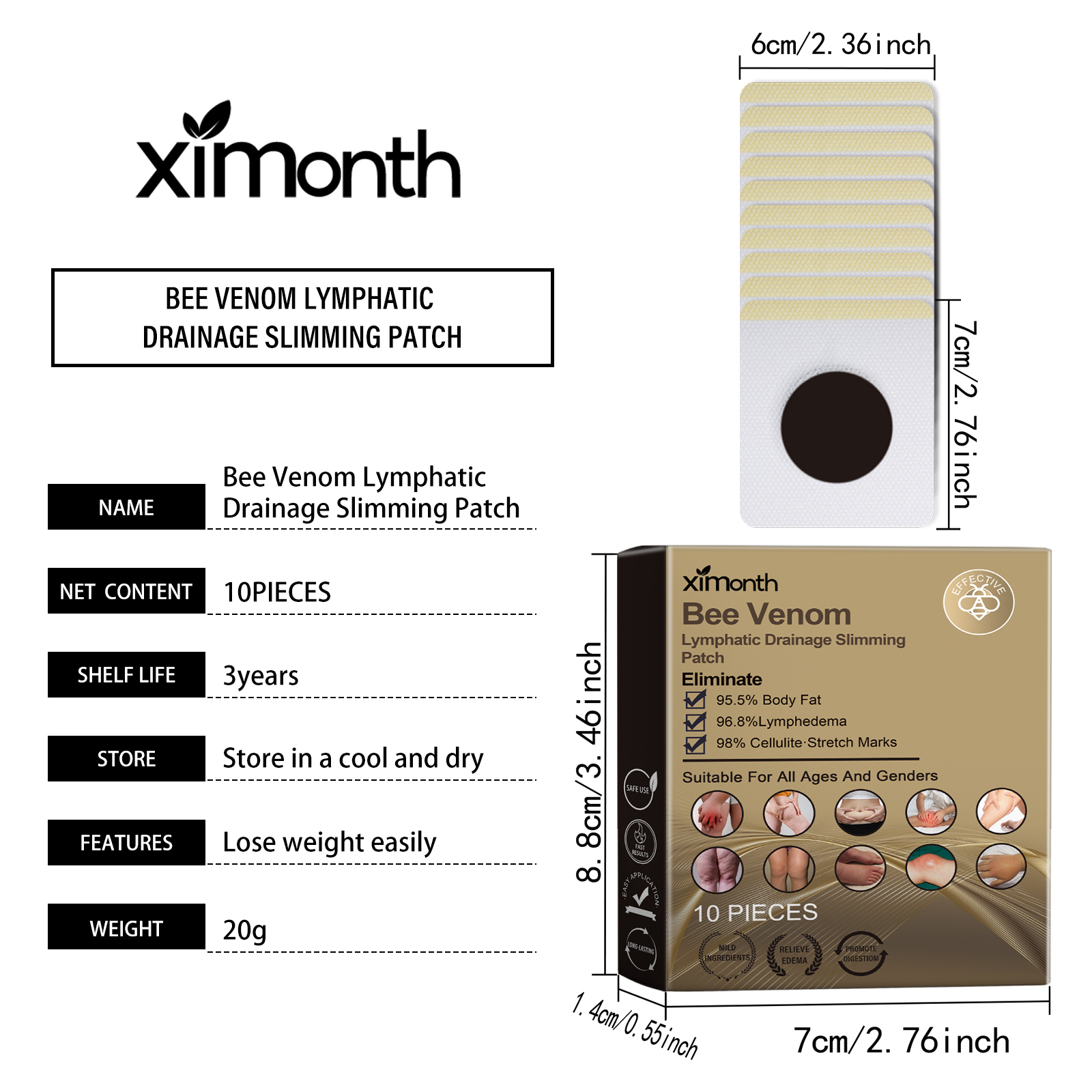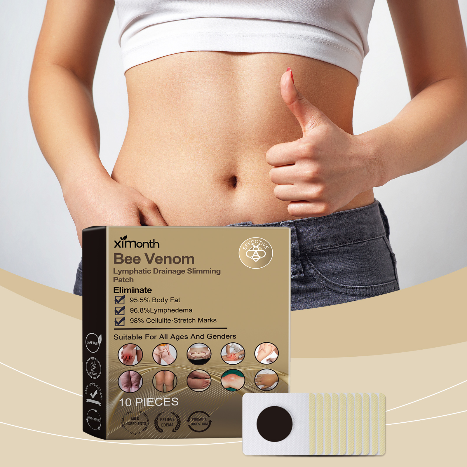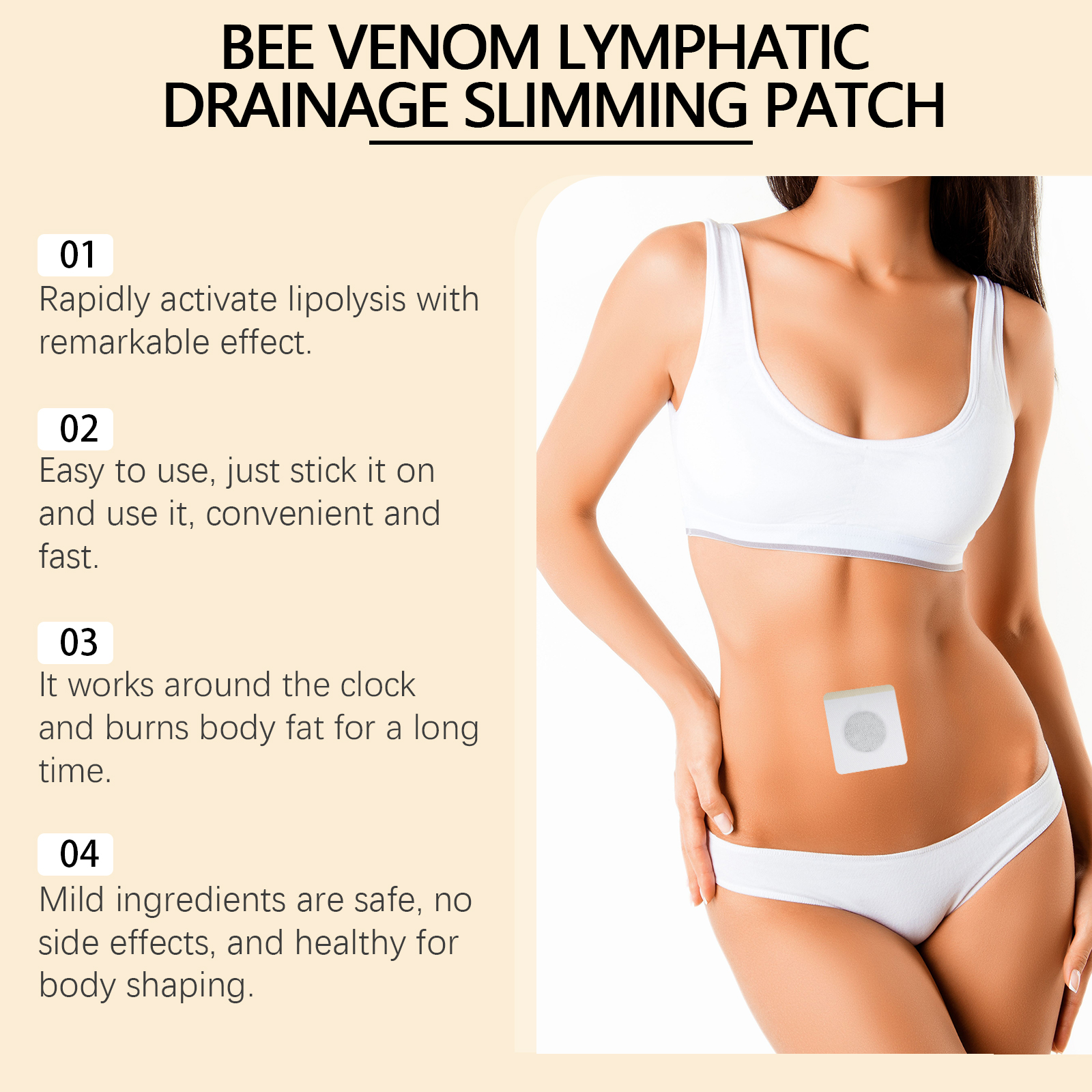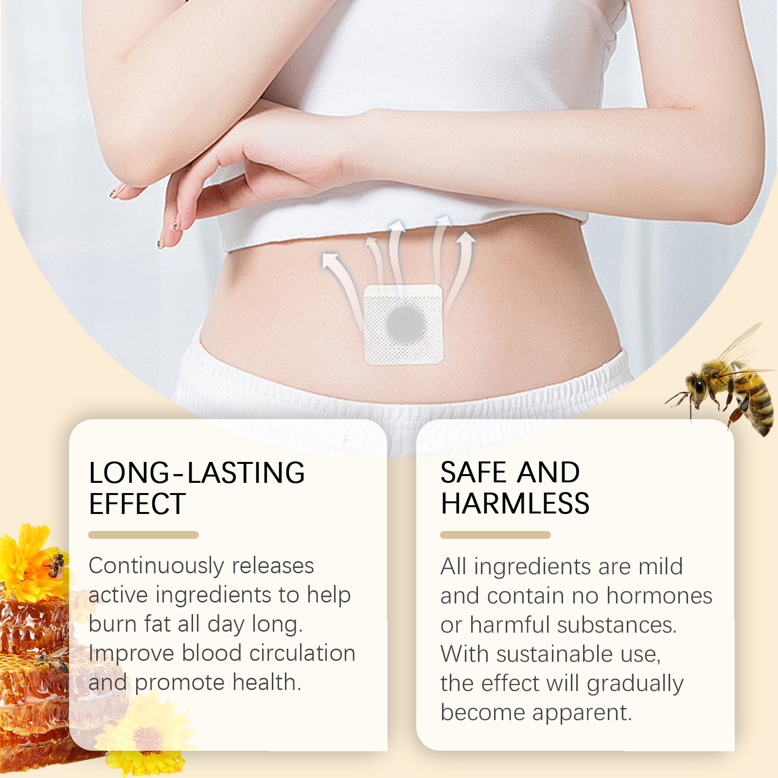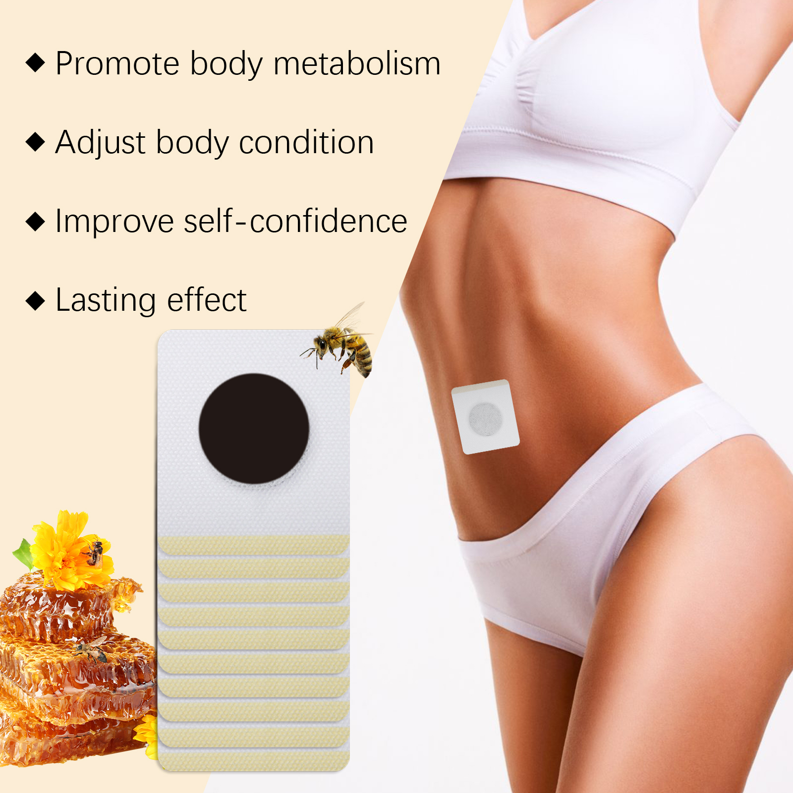 Our bee Venom Slimming patch contains bee venom, ginger root extract and peppermint extract. It continues to release active ingredients that help burn fat throughout the day. Improve blood circulation and promote health. All ingredients are mild and contain no hormones or harmful substances. With sustainable use, the effects will gradually become apparent. Its application method is simple: 1. Clean the skin around the belly button and keep it dry. 2. Place the patch on your belly button and gently press the patch to ensure proper adherence. 3. Wait 3-4 hours and then remove the patch. Bee Venom Slimming Stick uses gentle ingredients to quickly activate fat breakdown and effectively shape your body. Suitable for a variety of occasions, including work and home use.
