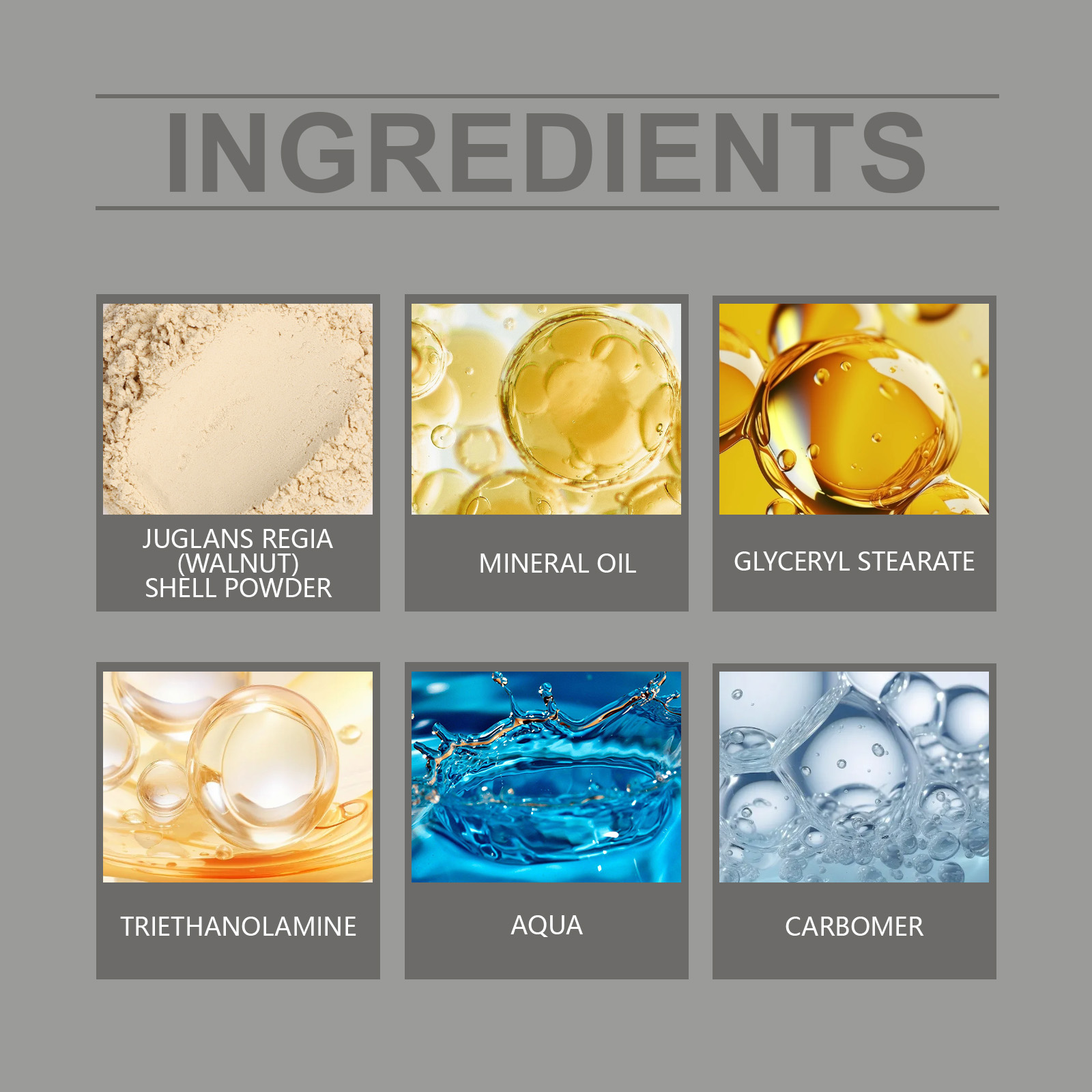 Our facial scrub contains walnut shell powder and mineral oil. It can gently remove old and dead skin cells, deeply cleanse spores, and make the skin more radiant. Its usage method is very simple: 1. Apply a layer of this product to a damp face and scrub in circular motions. 2. Rinse off with clean water and dry the skin. And it can effectively remove dirt and impurities on the surface of the skin, keeping the skin fresh and clean.