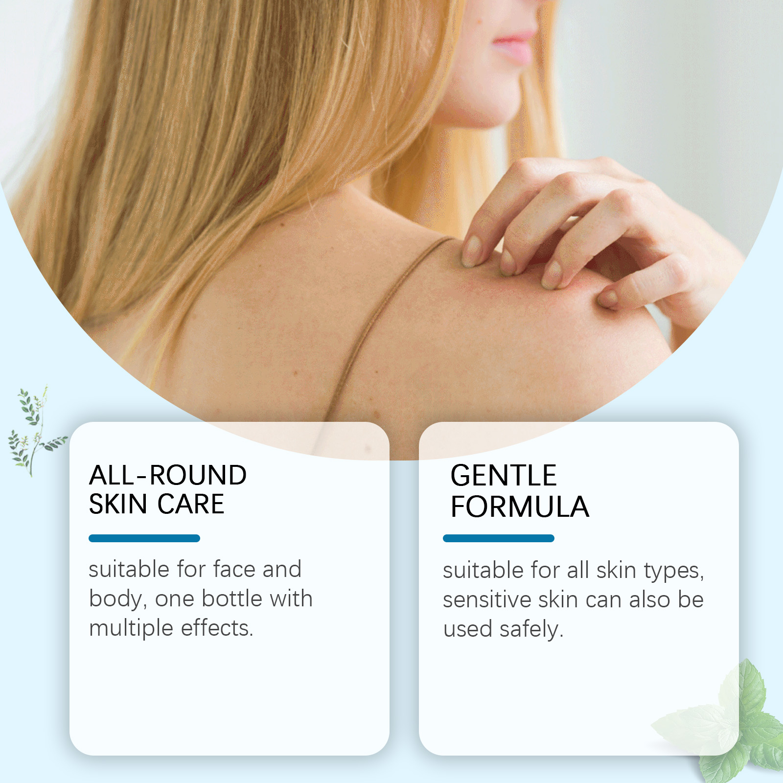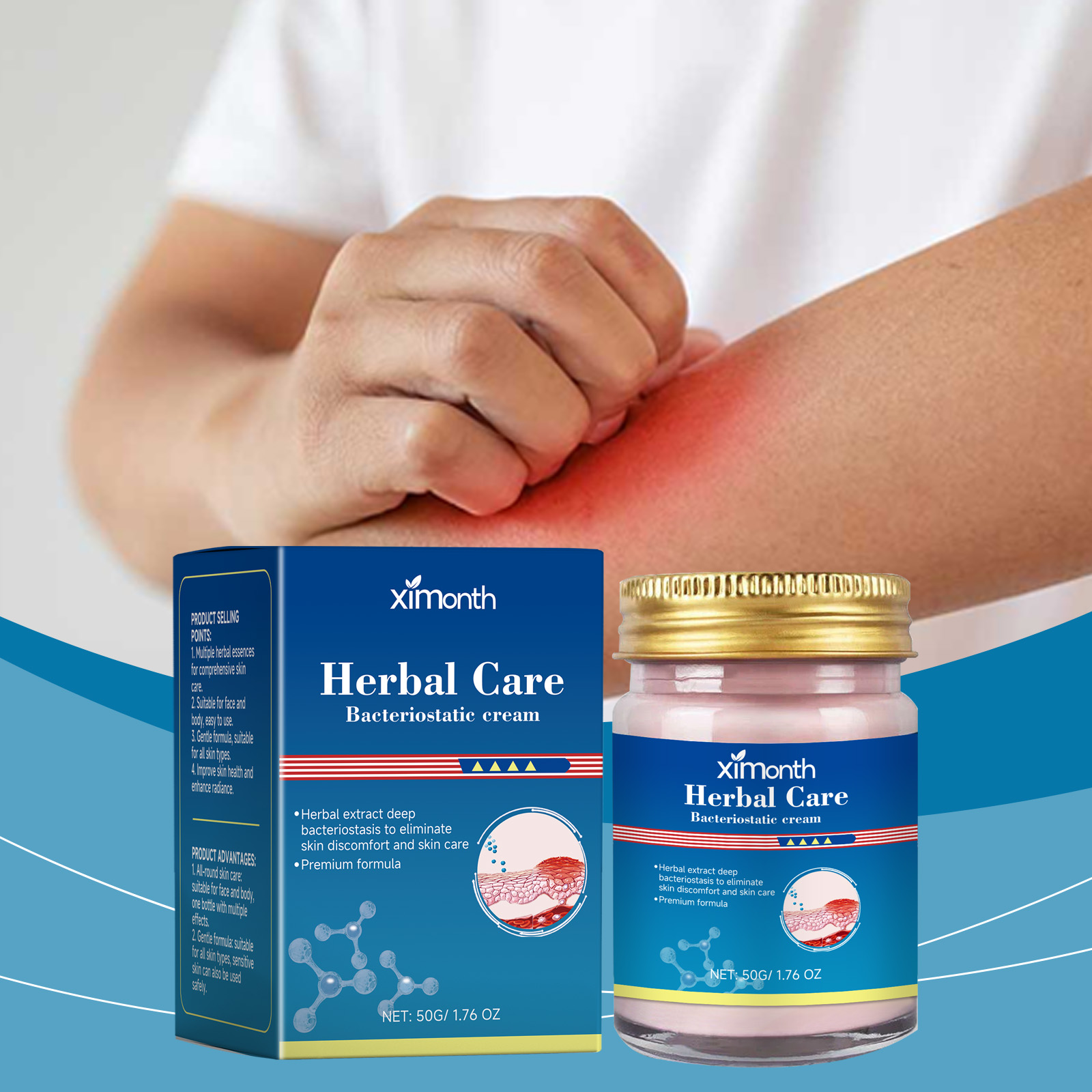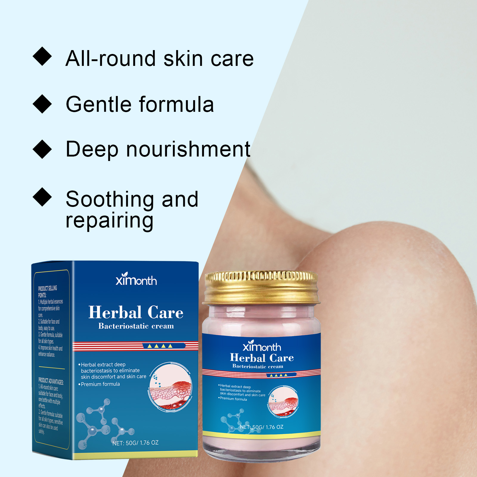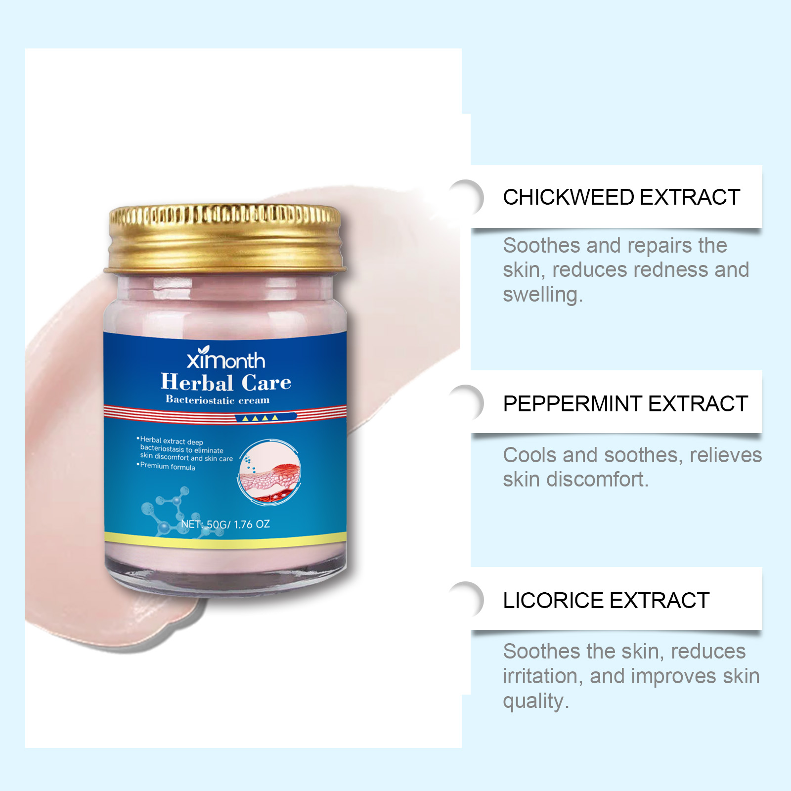 Our herbal skin care repair cream contains chickweed extract, honeysuckle extract, locust flower extract. It soothes and repairs the skin, reducing redness and swelling. Cool and soothing to relieve skin discomfort. Soothe skin, reduce irritation and improve skin quality. The way to use it is simple: 1. Clean your skin and keep it dry. 2. Apply an appropriate amount of face cream evenly to the face and itchy parts of the body. Massage gently to promote absorption. For the face and body, one bottle of multi-effect. Suitable for all skin types. It is also safe to use on sensitive skin.