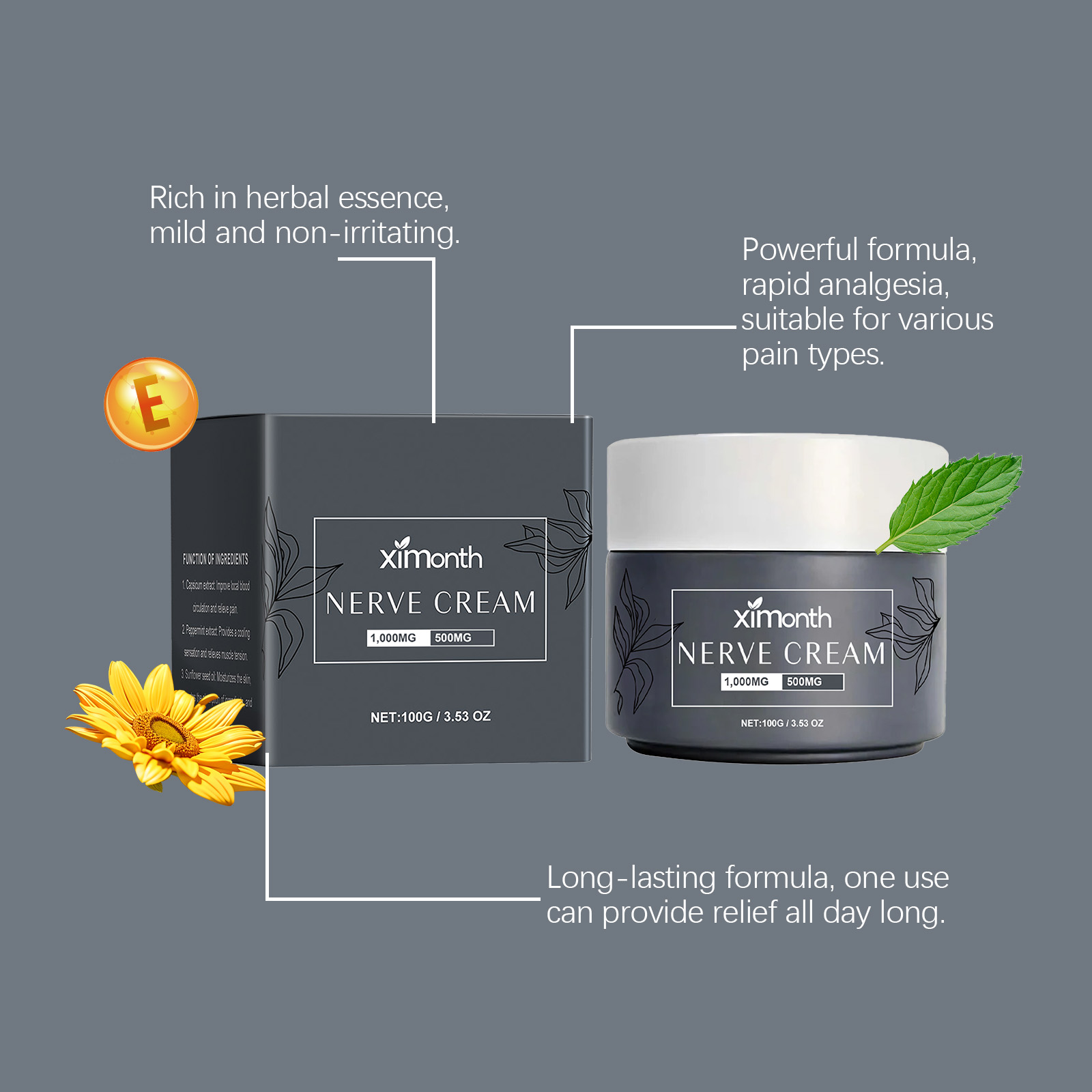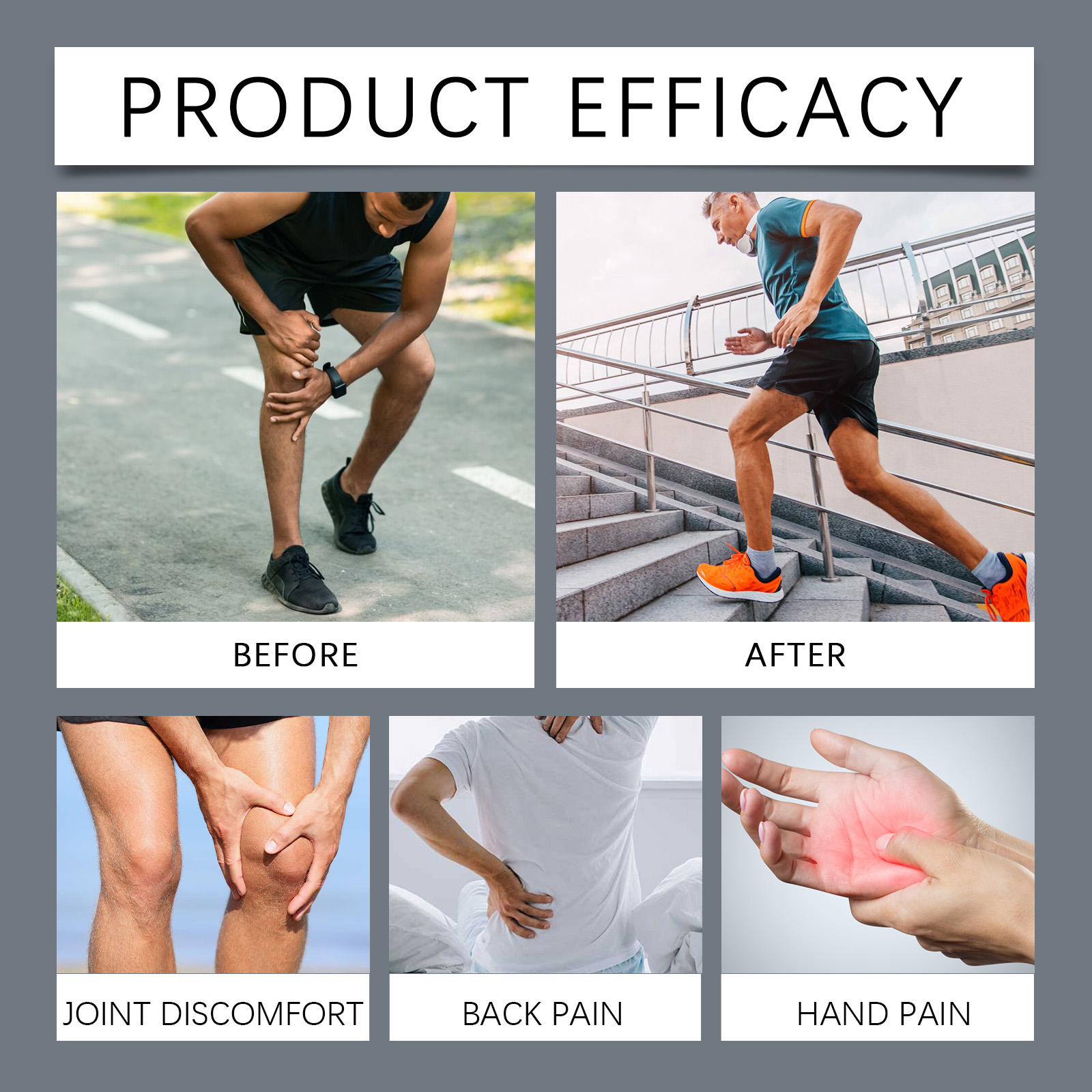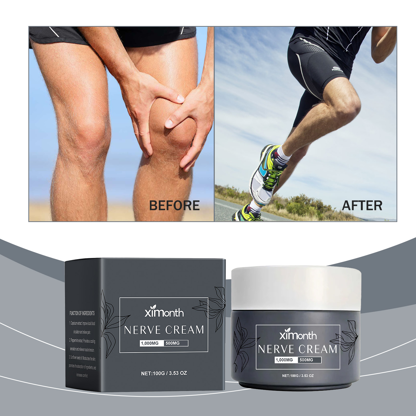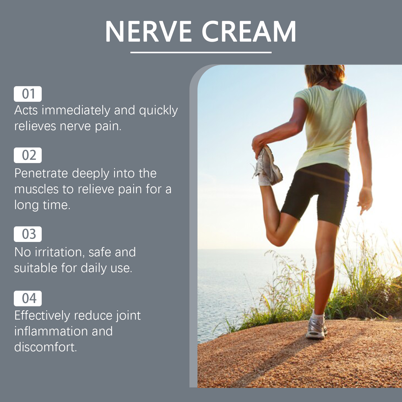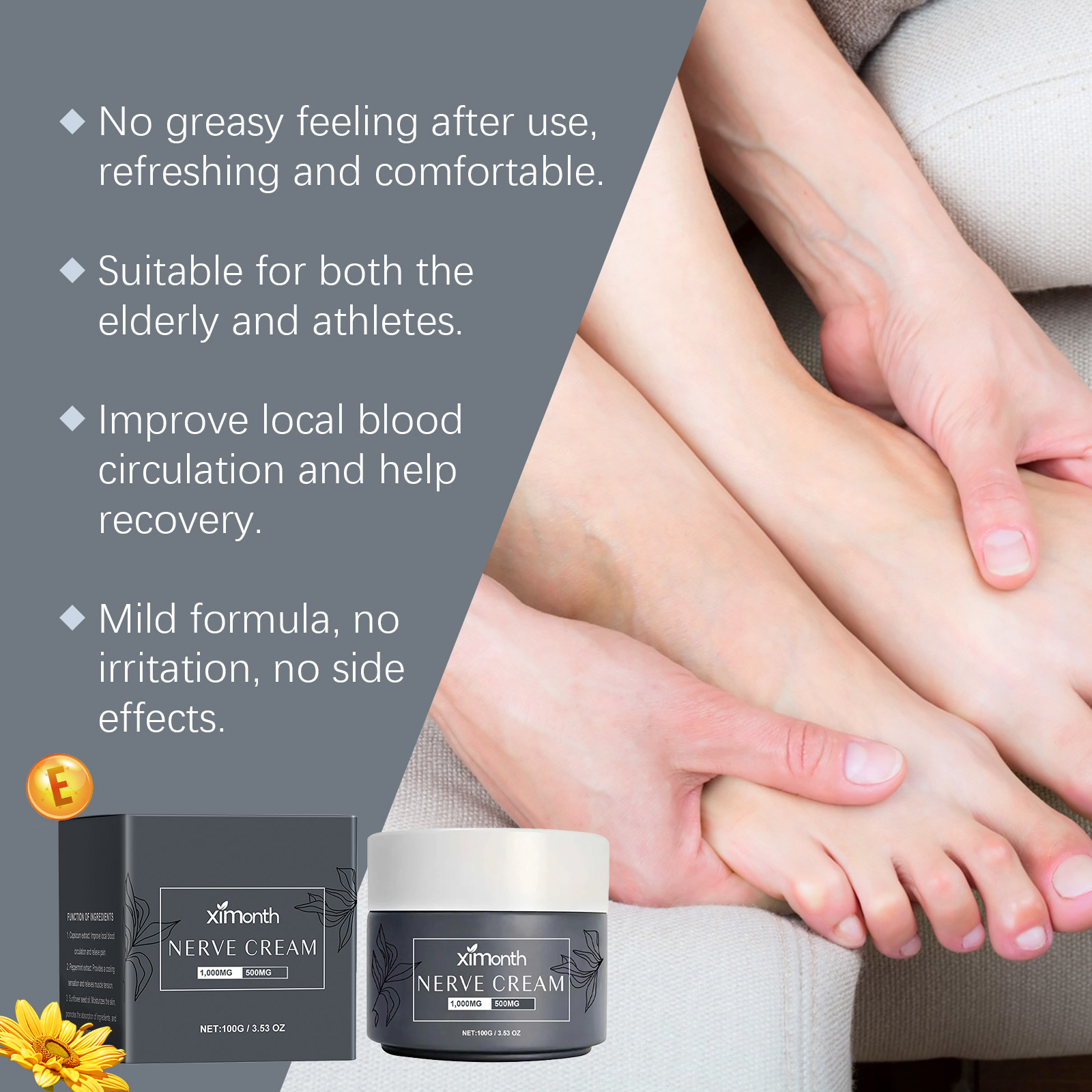 Our joint repair cream contains pepper extract, peppermint extract, sunflower seed oil. It can relieve joint and back pain quickly and has a long-lasting effect. Effectively reduce nerve pain response and relieve discomfort. Its application method is simple: 1. Thoroughly clean and dry the skin; 2. Apply appropriate amount of the product evenly on the skin of feet, toes, legs, joints and hands; 3. Gently massage to promote better absorption. Penetrate deep into the skin and reach the pain point, providing lasting relief.