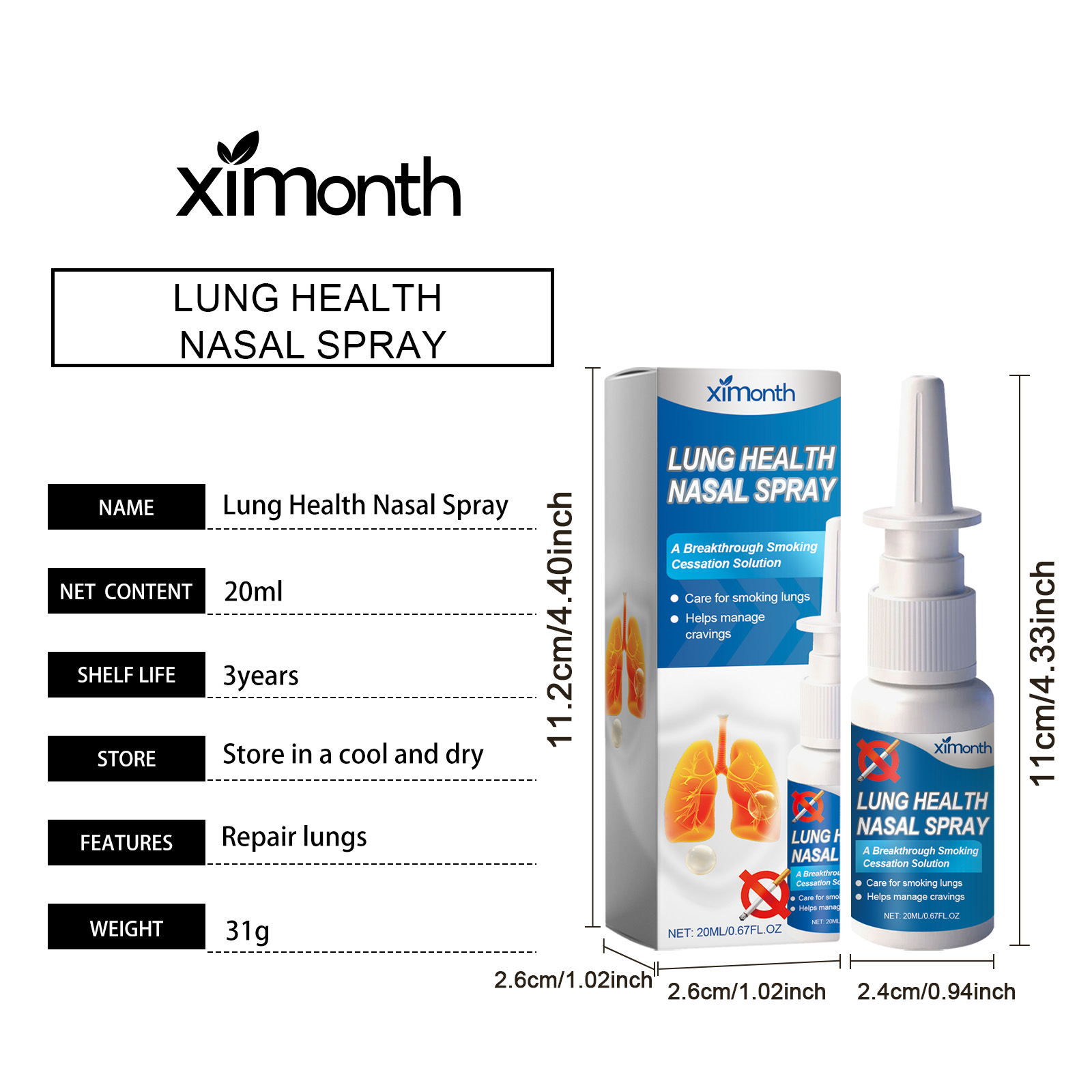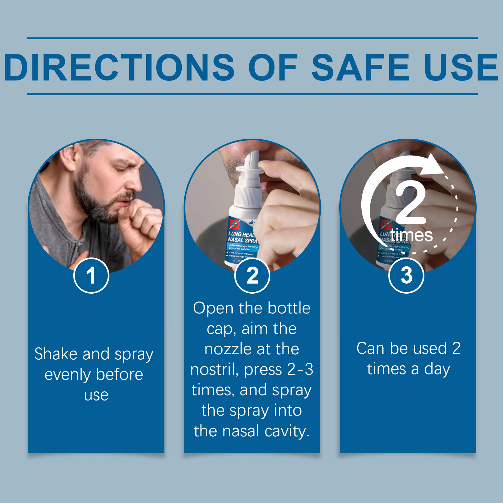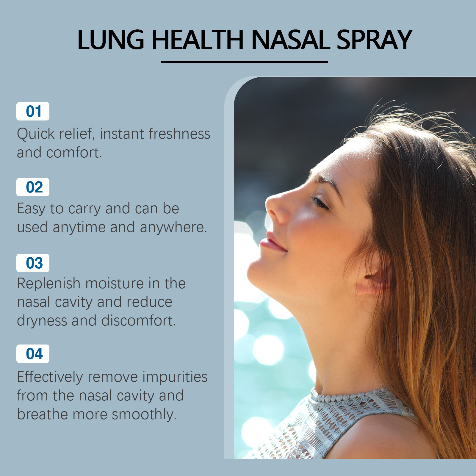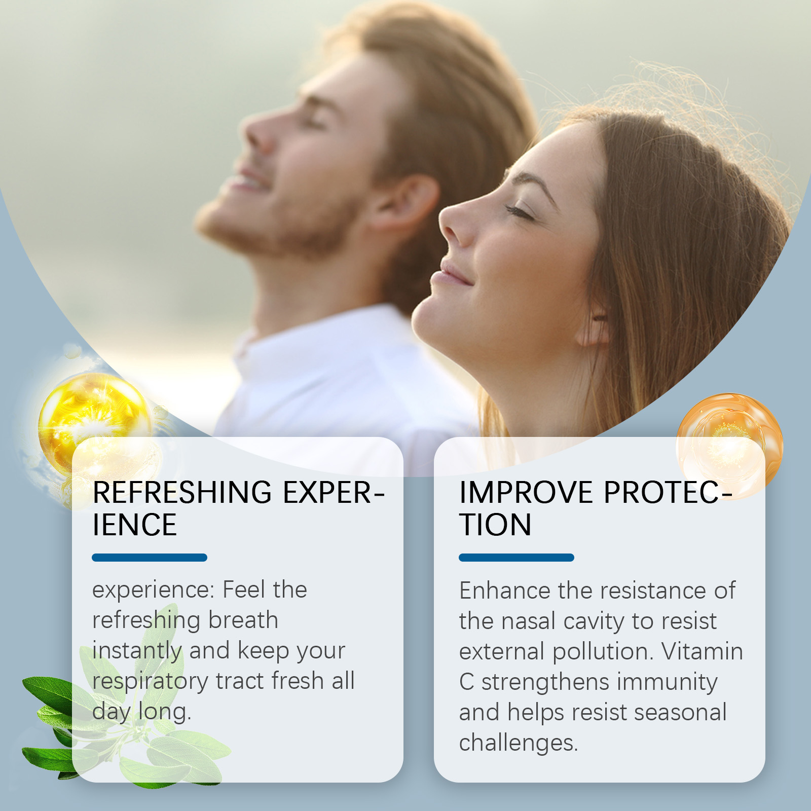 Our nasal lung spray contains guar gum, sage leaf extract, and vitamin E. It forms a protective membrane that reduces external irritation and keeps the nasal passages moist. Reduce discomfort and improve comfort. Effective antioxidant, promote metabolism, enhance nasal self-protection. Its use method is very simple: 1. Shake and spray before use; 2. Open the bottle cap, point the nozzle at the nostril, press 2-3 times, and spray the spray into the nasal cavity; 3. It can be used twice a day. Nasal lung cleansing spray enhances the ability of nasal passages to resist external contamination. Vitamin c can boost immunity and help ward off seasonal challenges. Antioxidant, promote the health of nasal mucosa; Vitamin C boosts immunity and helps protect against seasonal challenges. Feel your breath fresh and keep your airways fresh throughout the day.