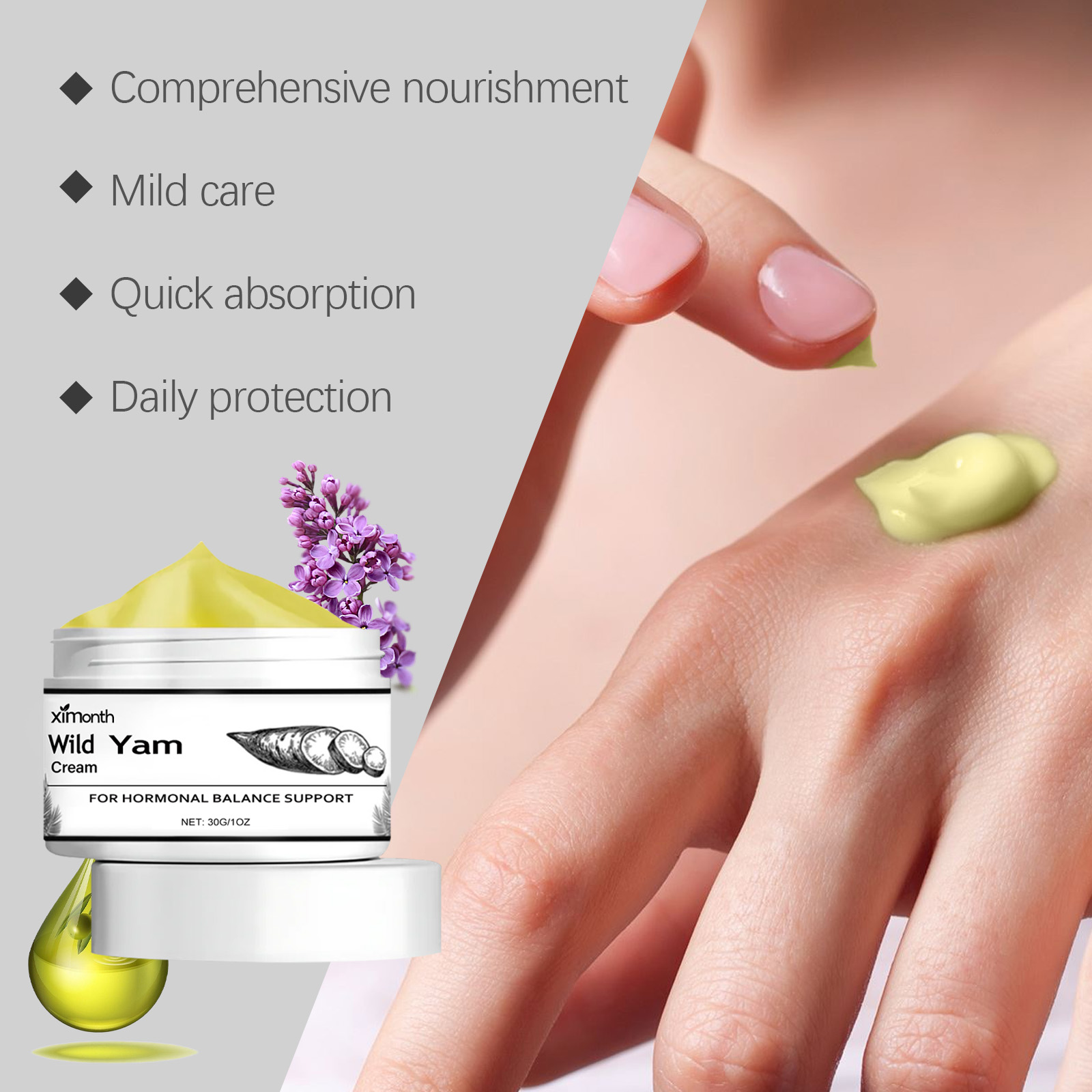 Our yam cream contains wild yam root extract, lavender oil, olive oil. It nourishes and softens the skin; Balance skin, soothe mood; Deep moisture, enhance skin elasticity. Its use method is very simple: 1. Clean the body skin, keep dry; 2. Apply appropriate amount to face, neck and chest. Abdomen, arms or inner thighs; 3. Gently massage until fully absorbed. Light texture, fast absorption, non-greasy, relieve menstrual discomfort, regulate the rule, maintain health.