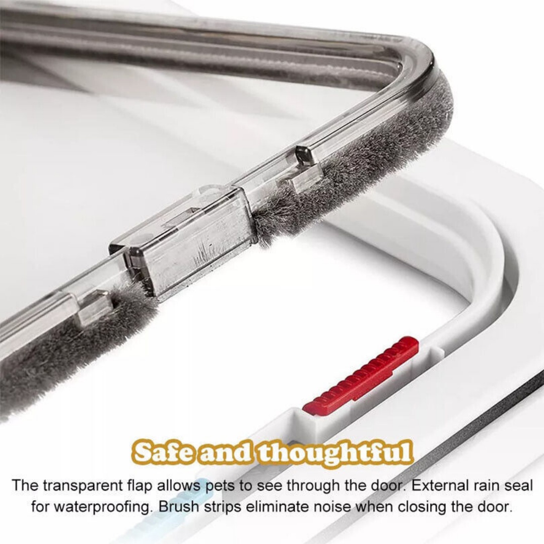 --- CONSIDERATE SAFETY: Transparent flap allows pets to see out of the door. Exterior rain seal keeps water out. Brush strip eliminates noise when closing the door.