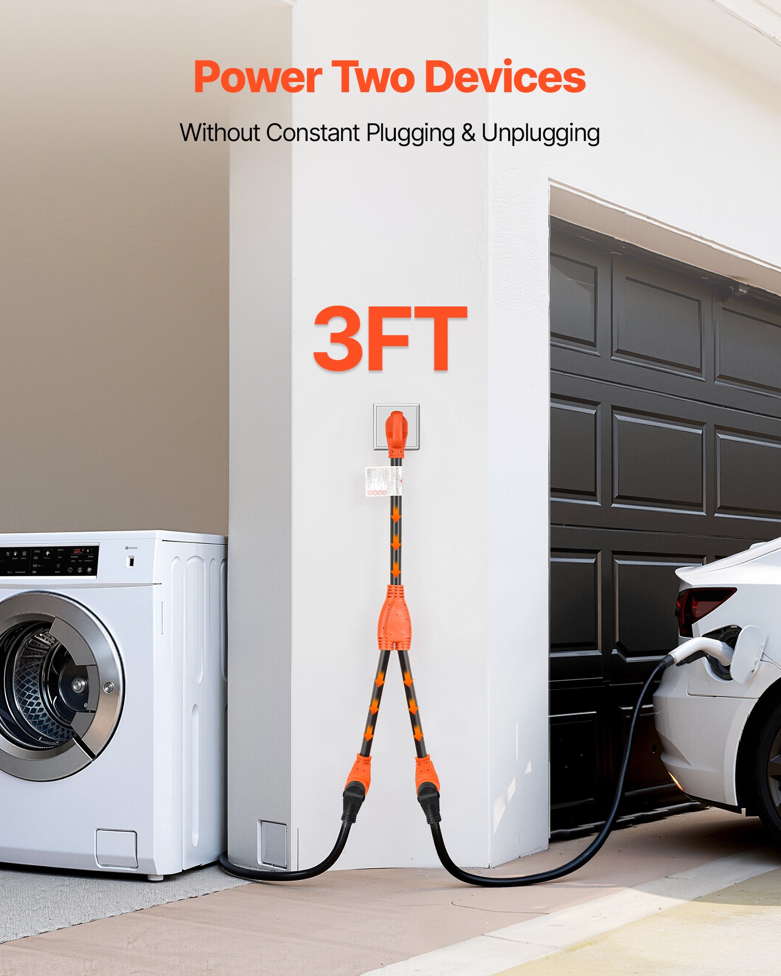 Splitter Adapter Cord: The NEMA 14-50 Y splitter adapter cord allows one outlet to power two devices at the same time, supporting RVs, EV charging, and dryers. It helps reduce frequent plugging and unplugging for added convenience