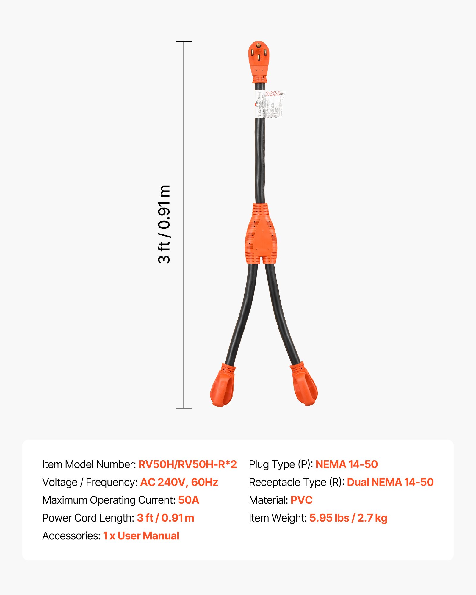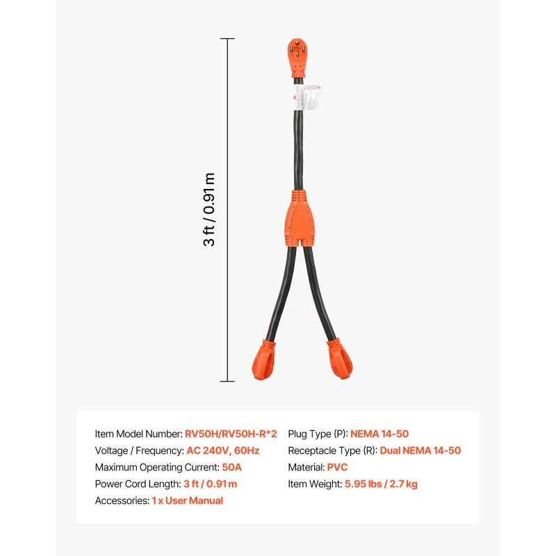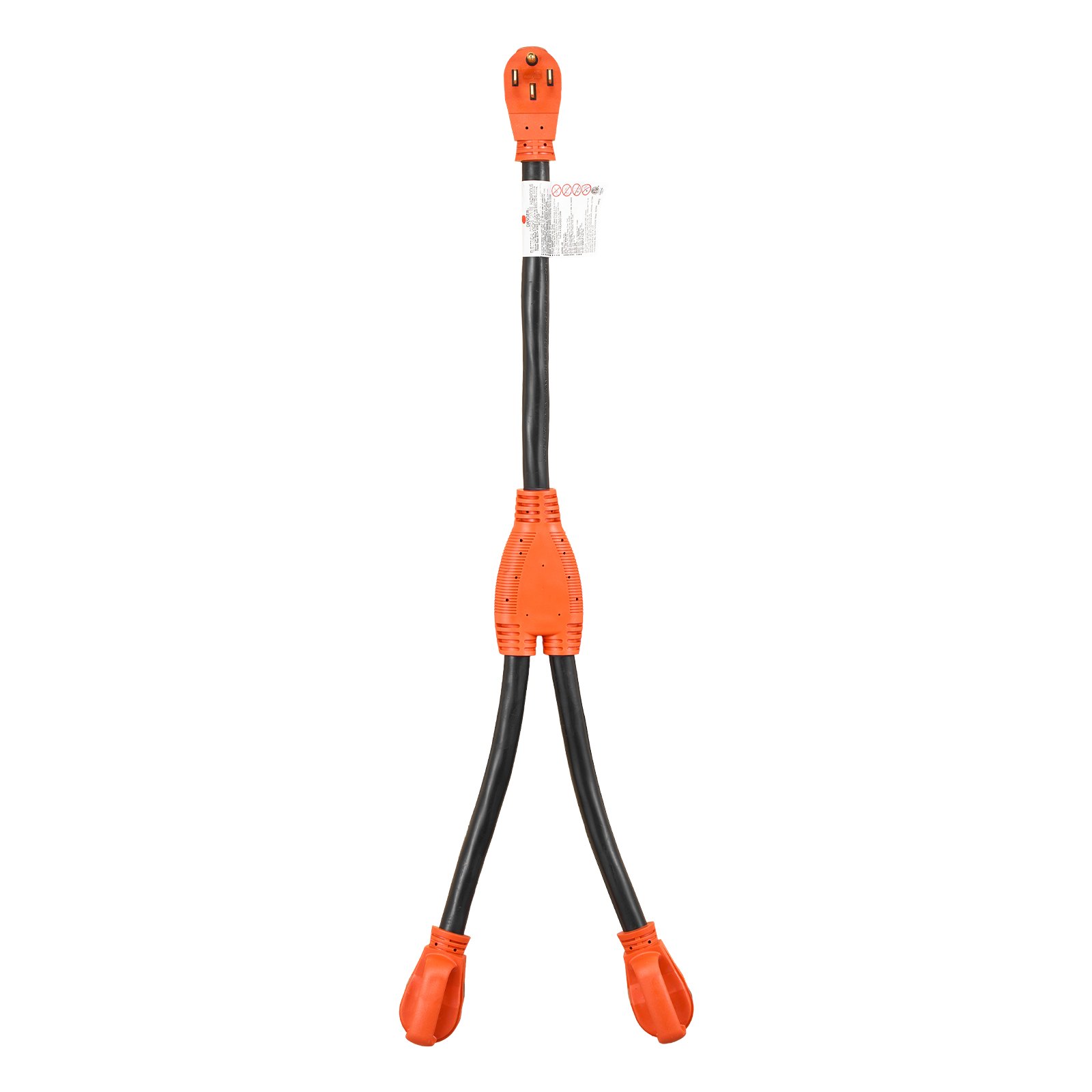 Dual NEMA 14-50 Outlets: Each outlet of this Y splitter extension cord features an independent cable layout to minimize plug interference, even with bulky adapters. It supports up to a 50-amp load