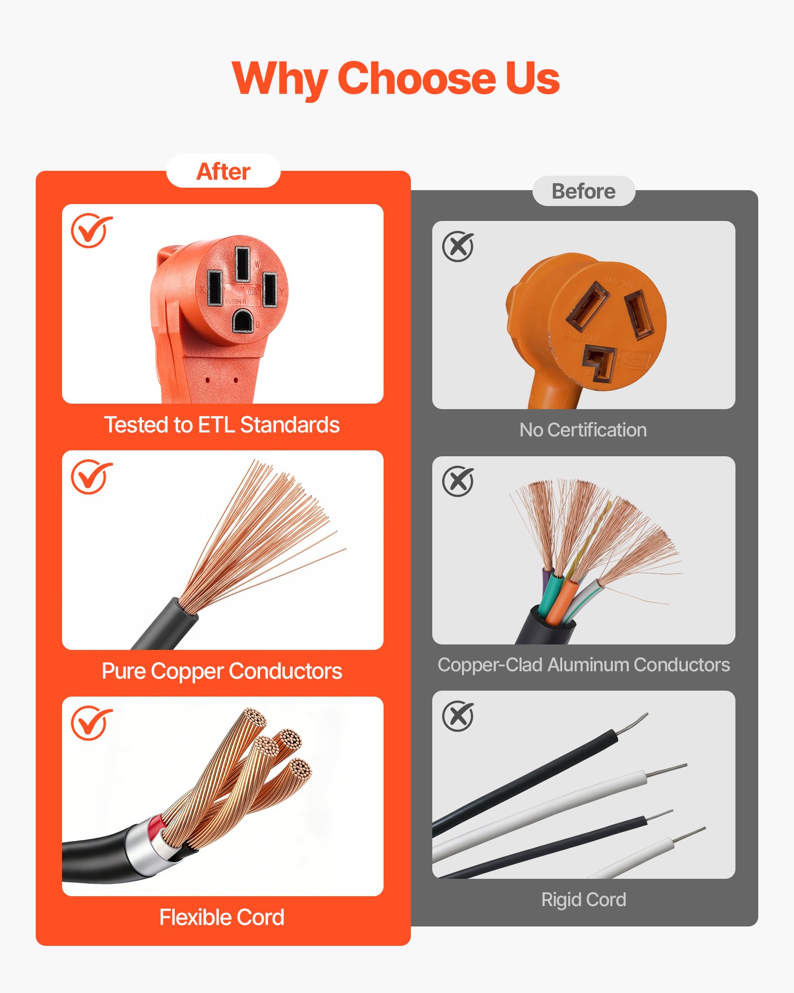 Durable for Indoor/Outdoor: Built for tough conditions, this RV/EV Y adapter cord can be detached in extreme temperatures. Pure copper conductor ensures corrosion and oxidation resistance, while the flame-retardant jacket provides corrosion protection