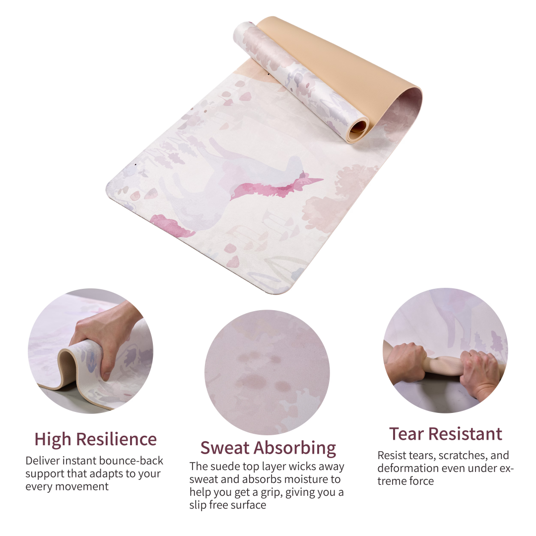 【Premium Material】: Our yoga mat's surface is made of suede material, soft and skin-friendly, excellent water absorption, can absorb sweat during exercise. The bottom is TPE which provides a durable and supportive base with anti tear layer. Measuring 72" x 24" x 0.16" (183cm x 61cm x 0.4cm), this spacious workout mat has ideal dimensions for all practices.