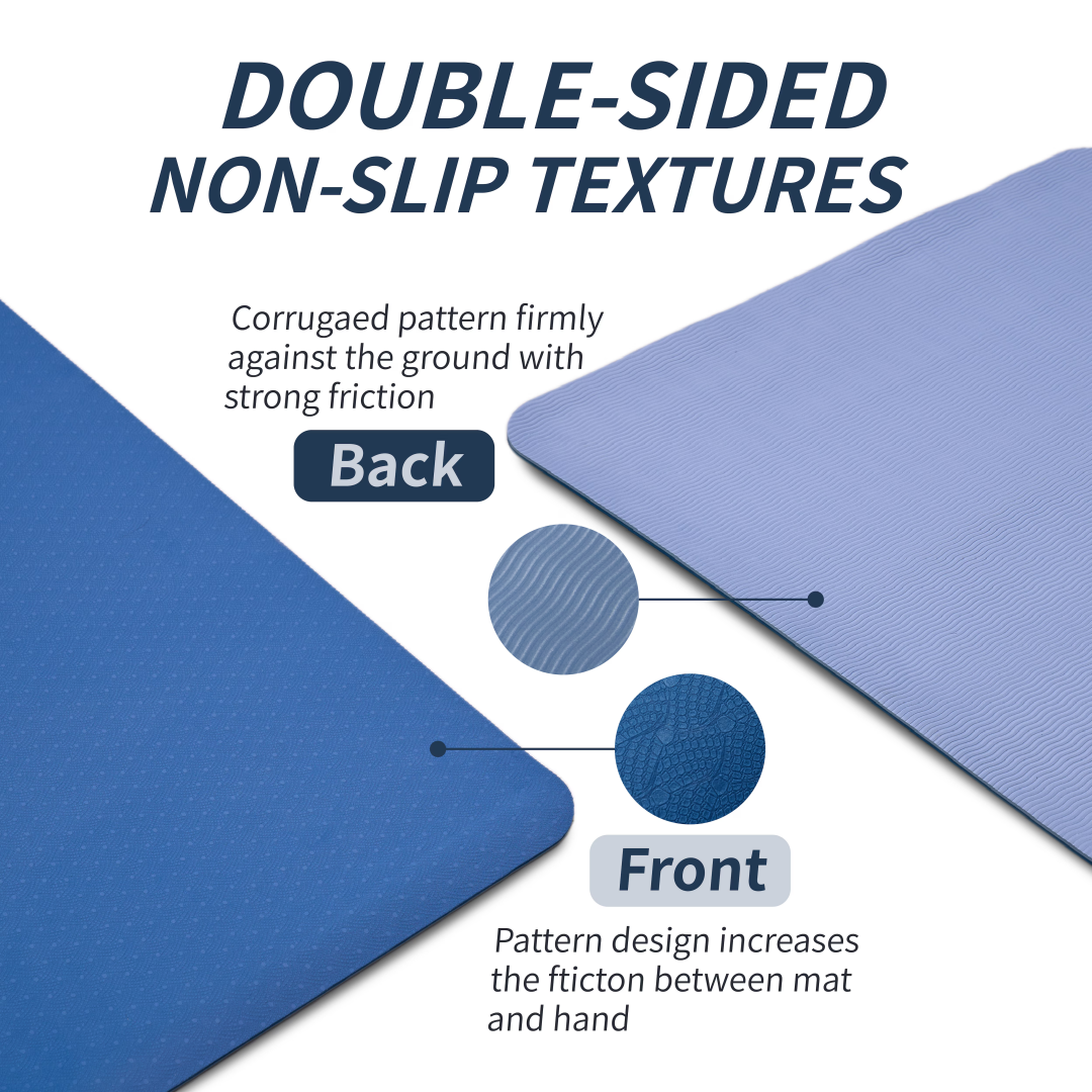 【Dual-Texture Non-Slip Surfaces】: Stay secure in every pose with dual-sided grip technology. The pattern textured layer of our yoga mats absorb sweat, offering a comfortable grip while the other side with a wave texture anchors firmly to floors—no slipping, sliding, or distractions.