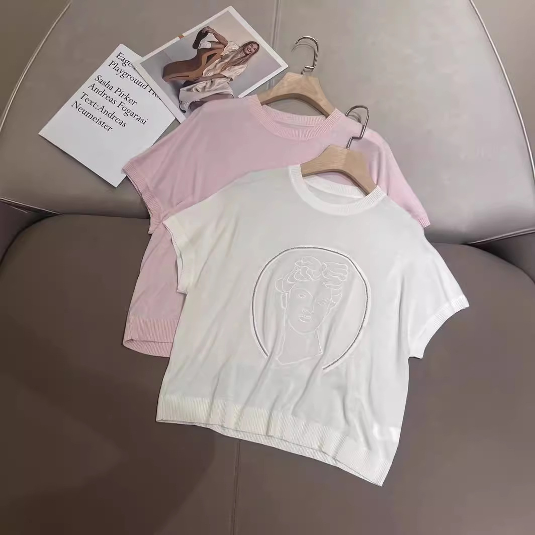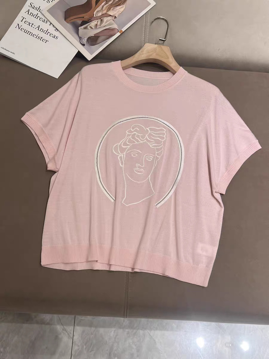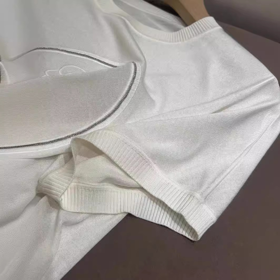Young Commuter Heavy Industry Beads Pattern Pullover Wool Knitwear Short Sleeve Women