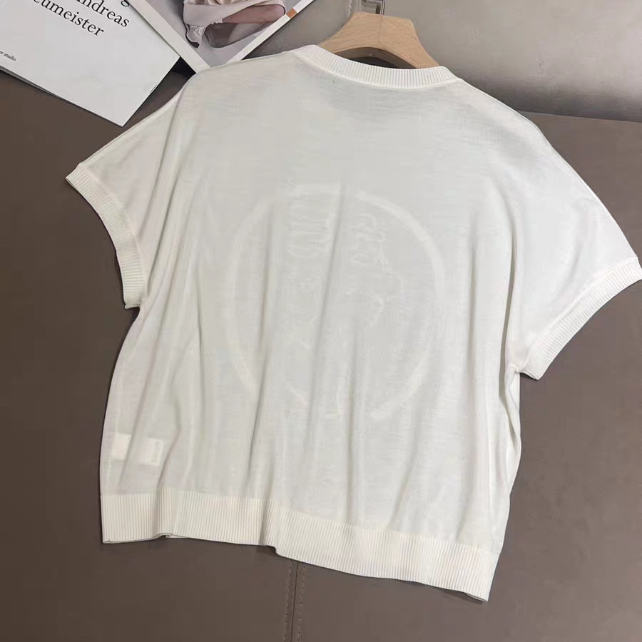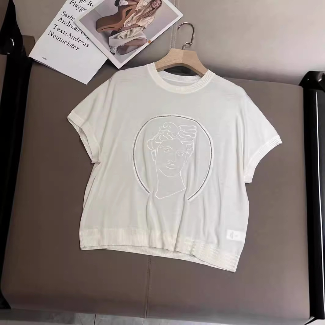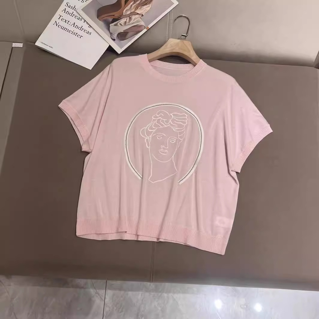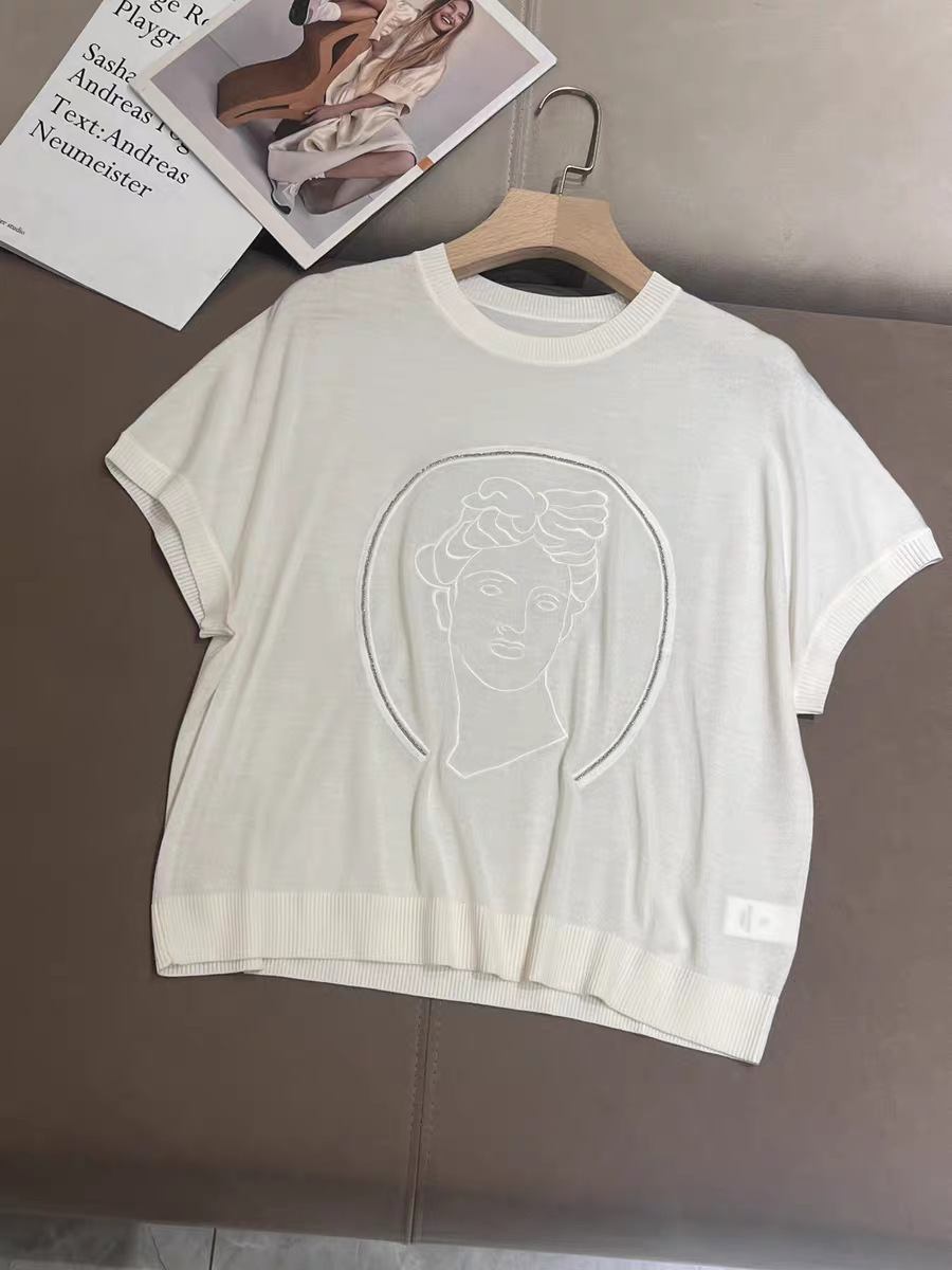 Young Commuter Heavy Industry Beads Pattern Pullover Wool Knitwear Short Sleeve Women