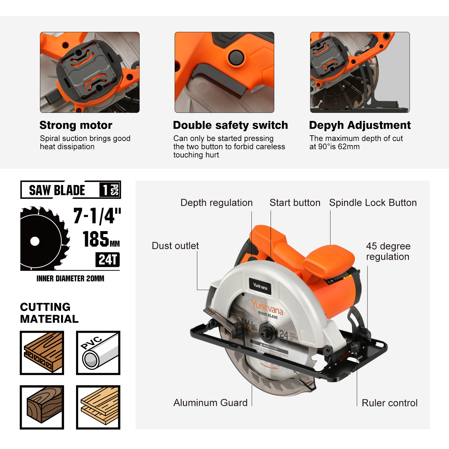 The Yunirvana circular saw is equipped with a 1400W motor and 6000 RPM, effortlessly handling various materials. Rubberized handle offers a comfortable grip, while the dual safety switch prevents accidental starts for reliable safety.
